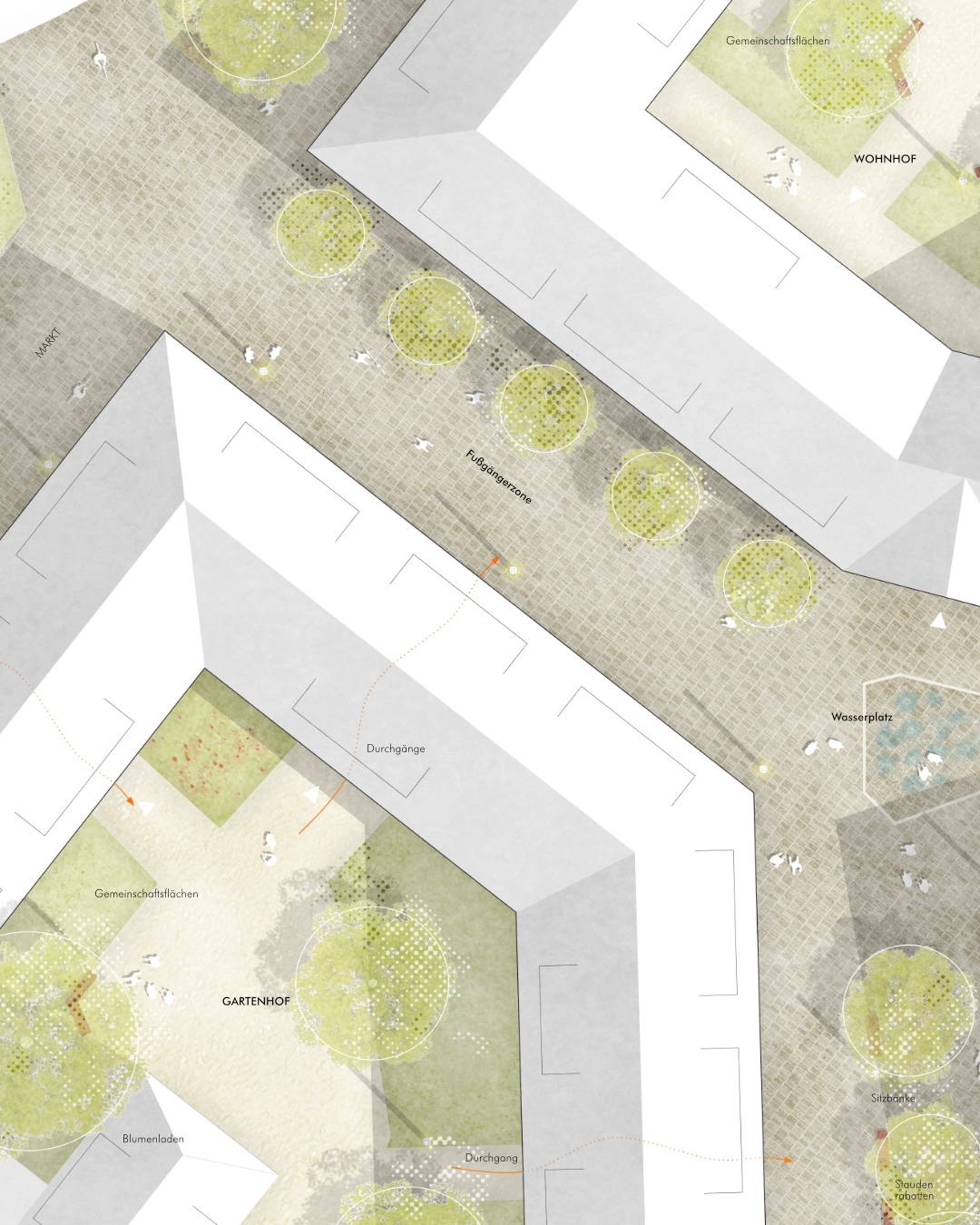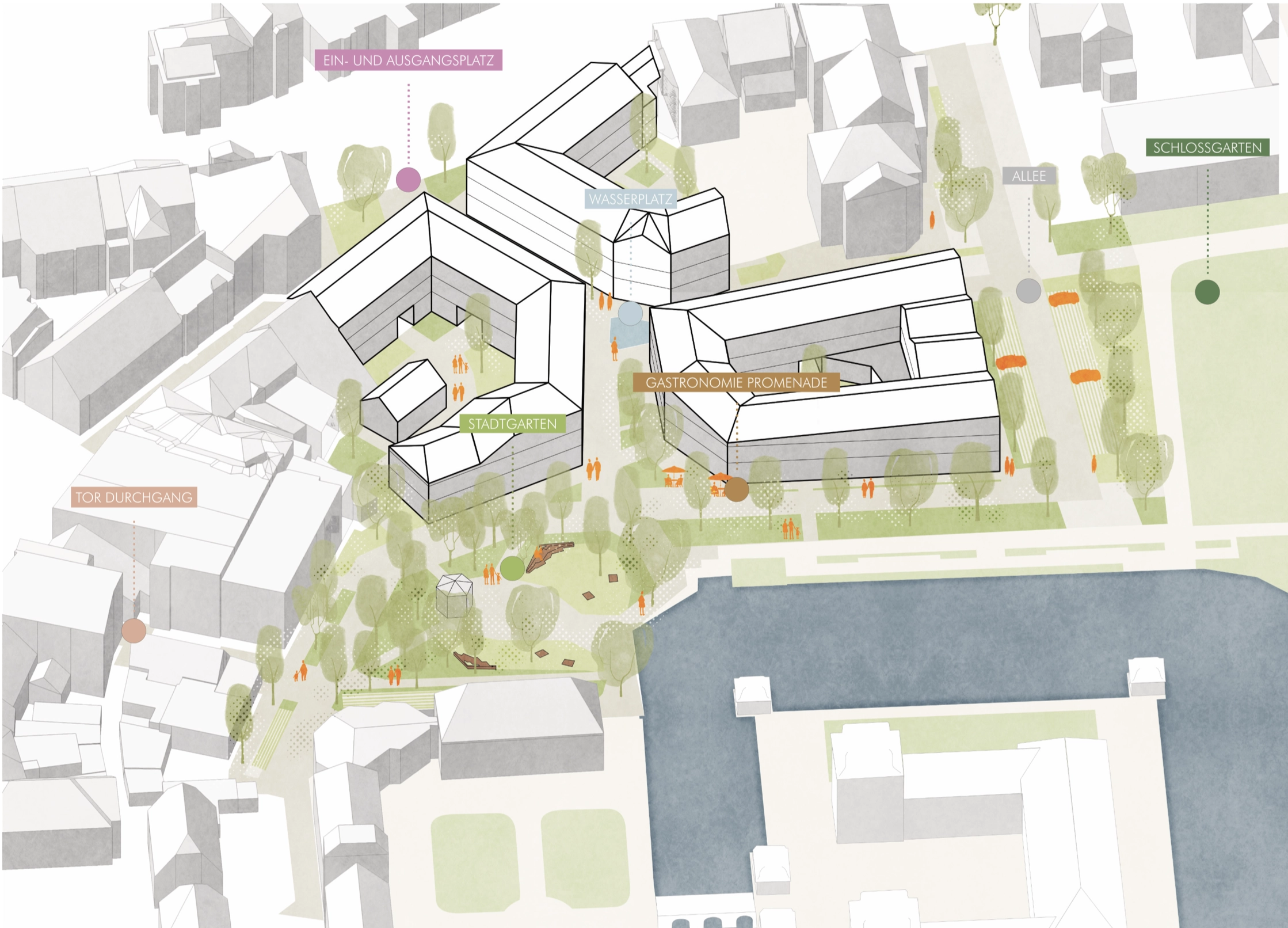 Drei Hofstrukturen bilden mit aktiven Erdgeschosszonen den Rahmen zur Fortführung der Fußgänger- zone als Gassen, die sich zur Schlossanlage hin öffnen und neue, unverbaute Blicke auf das historische Gebäude ermöglichen. Aus der entgegenlaufenden Richtung erweitern sich die Grünanlagen entlang des Schlossgrabens bis zur Fläche des ehemaligen Parkdecks. Zusammen mit den vorhandenen Freiflächen um den Schlossgraben herum entsteht ein grüner Saum, der in Verbindung mit den kleinteiligen Hofensembles für eine neue und qualitätsvolle Adressbildung des „Schlosshofquartiers“ sorgt.