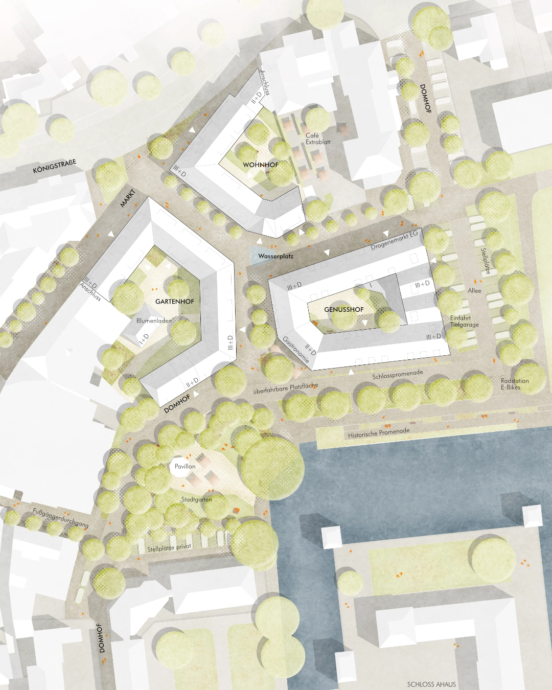 Das innerstädtische Gefüge wird dabei so ergänzt, dass von der Königstraße aus, die historischen Schlossanlage mit ihren Grünanlagen selbstverständlich wahrgenommen werden kann.
