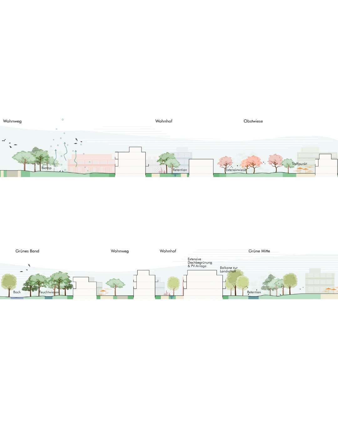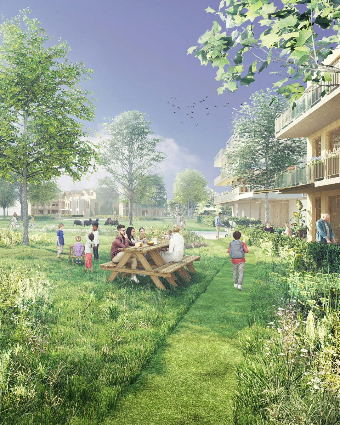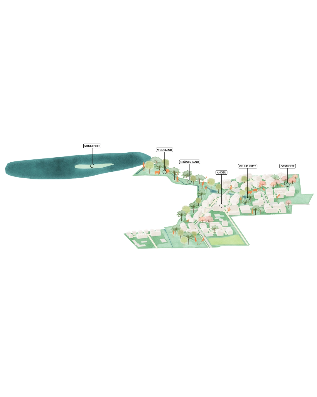Das Landschaftsquartett, das vier lebendige Nachbarschaften in eine vielseitige Landschaft mit Streuobstwiesen, Biotopen und Weideflächen einbettet. Autofrei, gemeinschaftlich und naturnah. Gemeinschaftshöfe, Kita, Gastronomie und nachhaltige Mobilität schaffen ein zukunftsfähiges Wohnquartier mit direktem Zugang zur Natur. Ein grüner Bogen verbindet das Quartier bis zum Sonnensee, perfekt zum Spazieren, Spielen und Durchatmen.