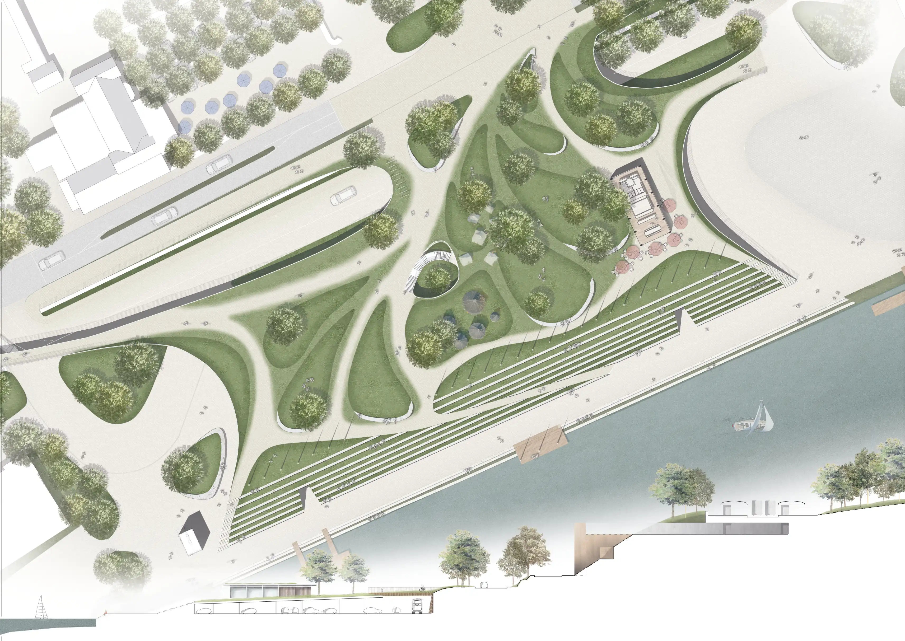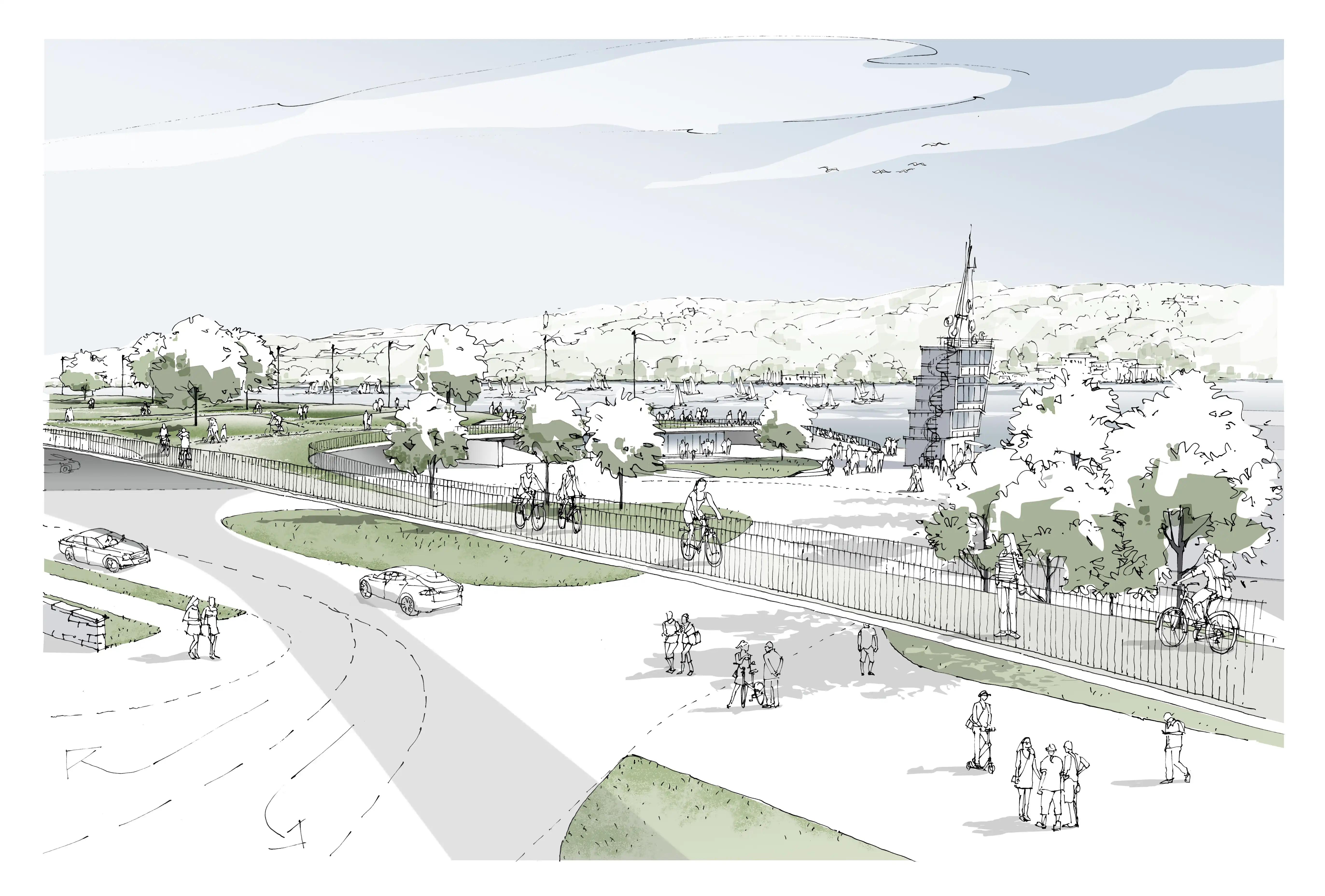 Das Grundstück mit Seezugang wird ganzjährig durch verschiedenste Nutzergruppen bespielt. Ziel der Überplanung der bestehenden Anlage ist es, die Aufenthaltsqualität zu steigern, das Angebot der sportlichen Aktivitäten auszubauen und die in die Jahre gekommene Tribünenanlage für die nähere Zukunft zu rüsten. Dabei steht nicht nur die Nutzung als Tribüne im Vordergrund, sondern auch eine Aufwertung des gesamten städtebaulichen Umfeldes mit Erhöhung der ganzjährigen Freizeitwerte.
