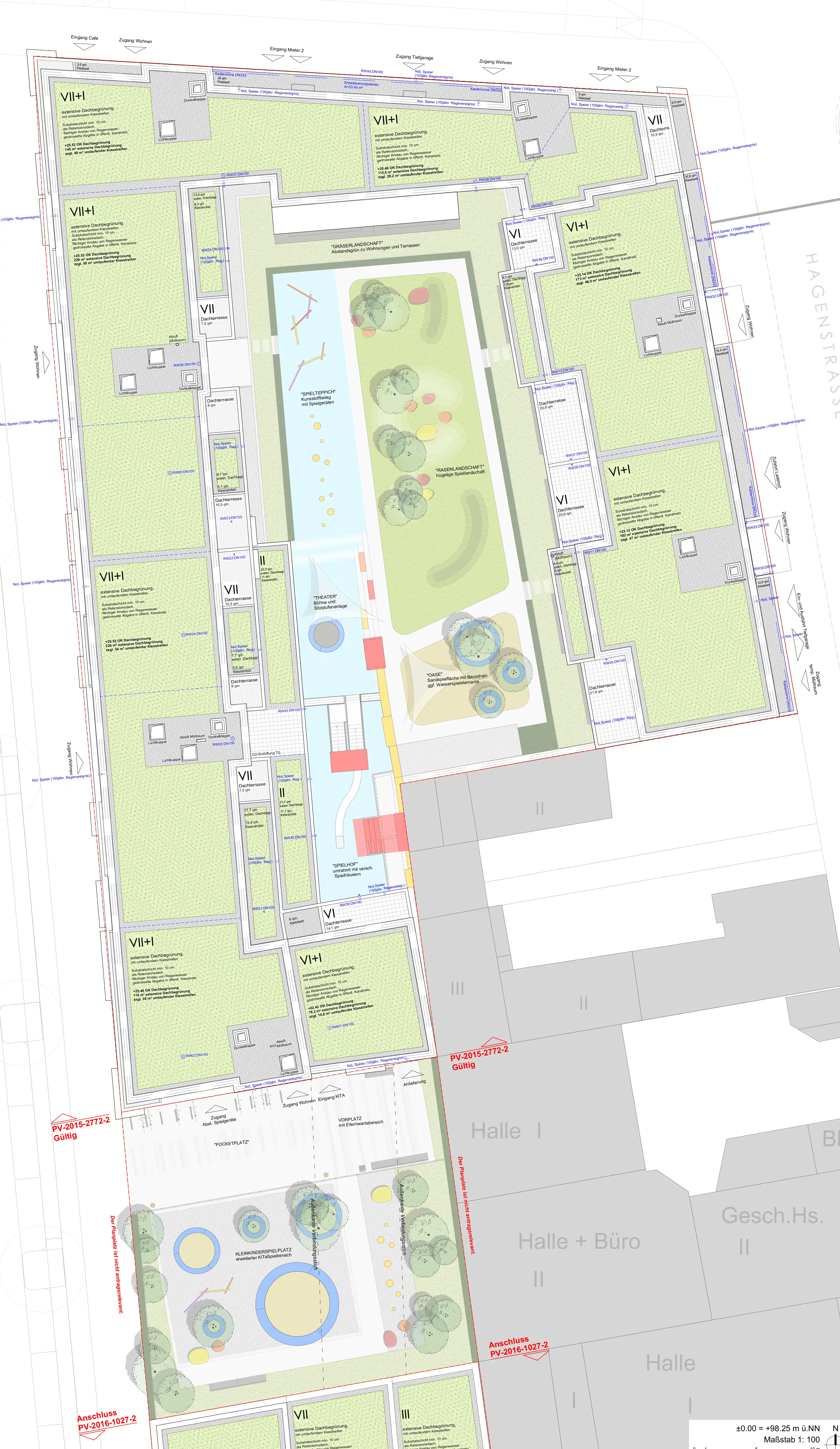 Auf der Zwischenebene gibt es eine großzügige Anlage von Sitzstufen mit verschiedenfarbigen Kunststoffsitzauflagen und einem kleinen Holzpodest. Dieses Forum kann bei Bedarf als Bühne für Aufführungen genutzt werden. Bei sonnigen Tagen spendet ein Sonnensegel Schatten. Der Bodenbelag schlägt in zwei sanften Wellen hinauf auf die Dachfläche des 1. Obergeschosses.
