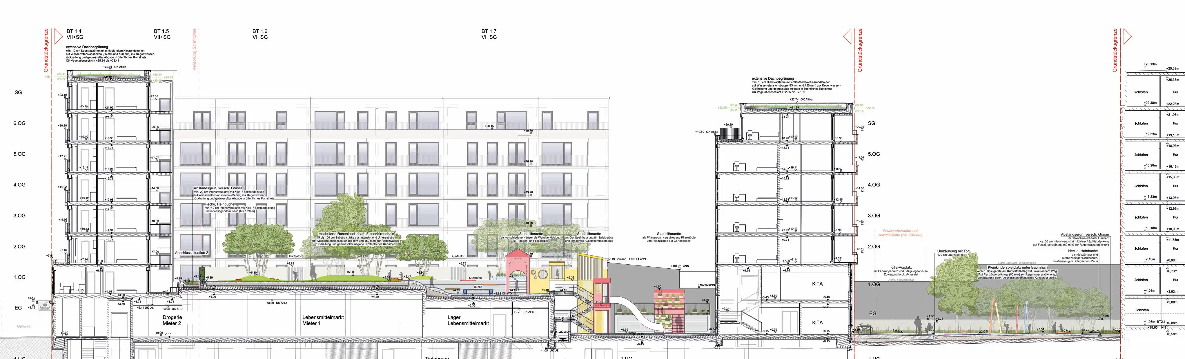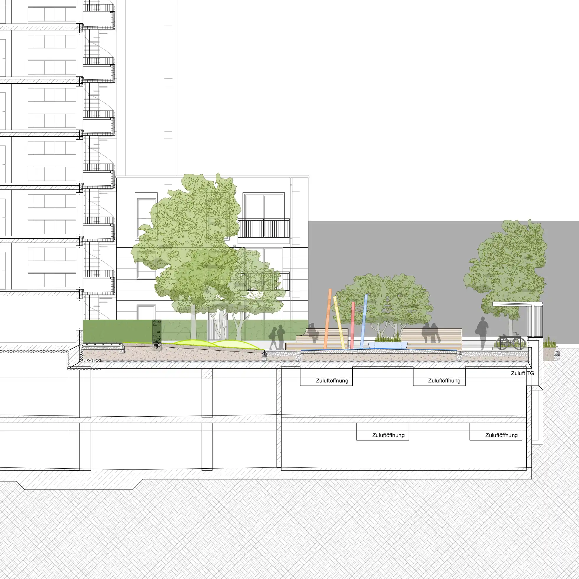 Im Erdgeschoss beginnend verläuft ein großzügiger Tartan-Teppich über die Zwischenebene bis hinauf in das 1. Obergeschoss. Der kleine Hofbereich im Erdgeschoss thematisiert dabei die Hochhauslandschaft Frankfurts. Auf die Fassade aufgebrachte Silhouetten von Hochhäusern dienen als bunte, lebhafte Wandverkleidung. Das Lüftungsbauwerk im Tiefhof wird begehbar gemacht und bietet als Gartenpodest Grün in dem Hof und ermöglicht die Aufzucht verschiedener Kräuter und Gemüse in Pflanzkisten und Töpfen. Der Treppenturm zur Zwischenebene wird teilweise eingehaust und als Spielhaus mit Rutschenturm nutz- und bespielbar gemacht.