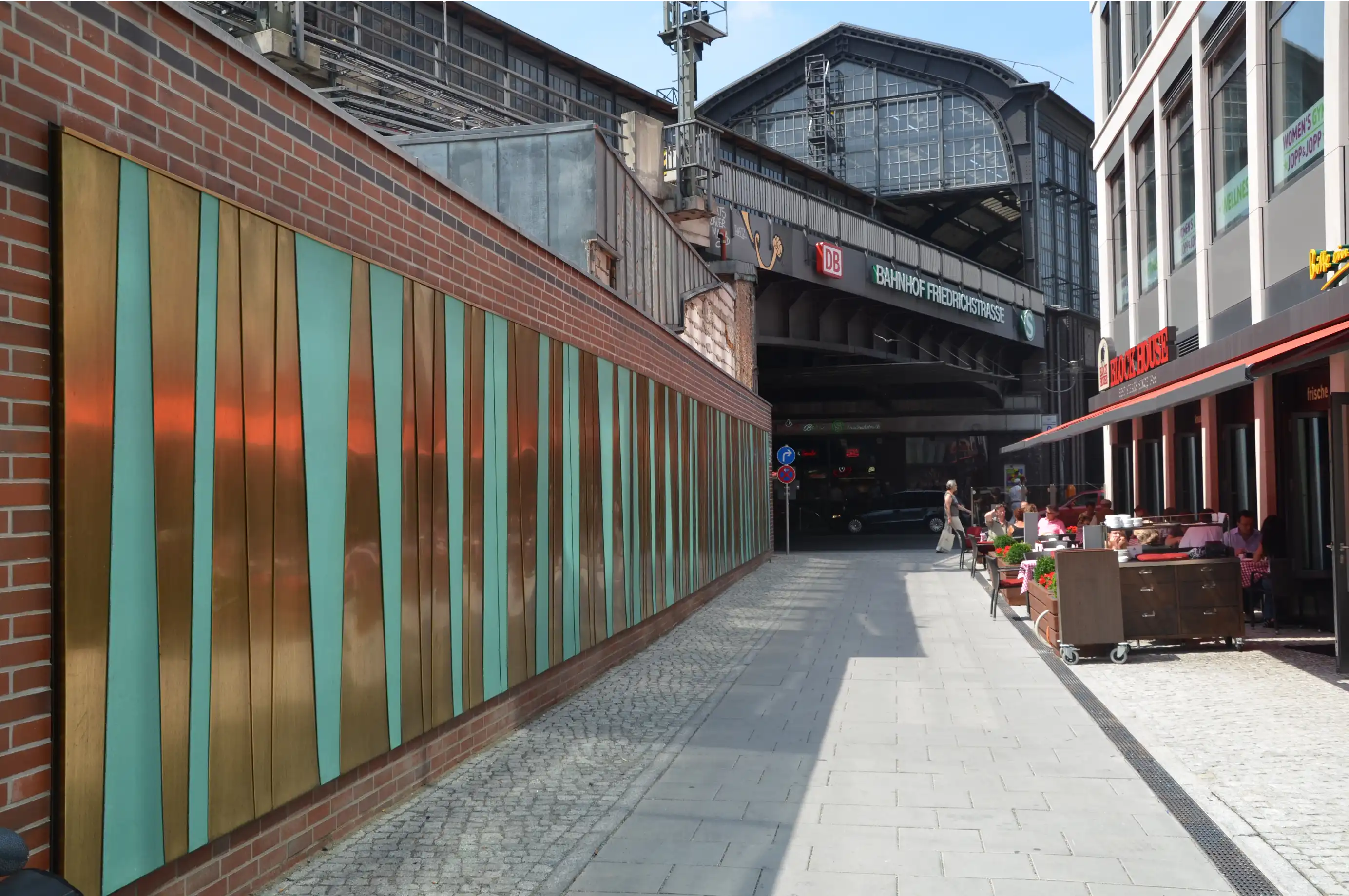 Als Besonderheit wurde die Gestaltung der Mauer mit einem Wandrelief aus unterschiedlich patinierten Kupferplatten auf einer klassischen Klinkermauer ergänzt. Hierdurch entsteht eine attraktive Begleitung von der Friedrichstraße durch die Passage zur Bibliothek der Humboldt-Universität und sorgt seit 10 Jahren dafür, dass die lange Wand nicht von Plakaten beklebt oder mit Graffitis besprüht wird. Leider wurde ein Wasservorhang vor dem Hoteleingang bisher nicht restauriert. Vielleicht kommt das ja noch.
