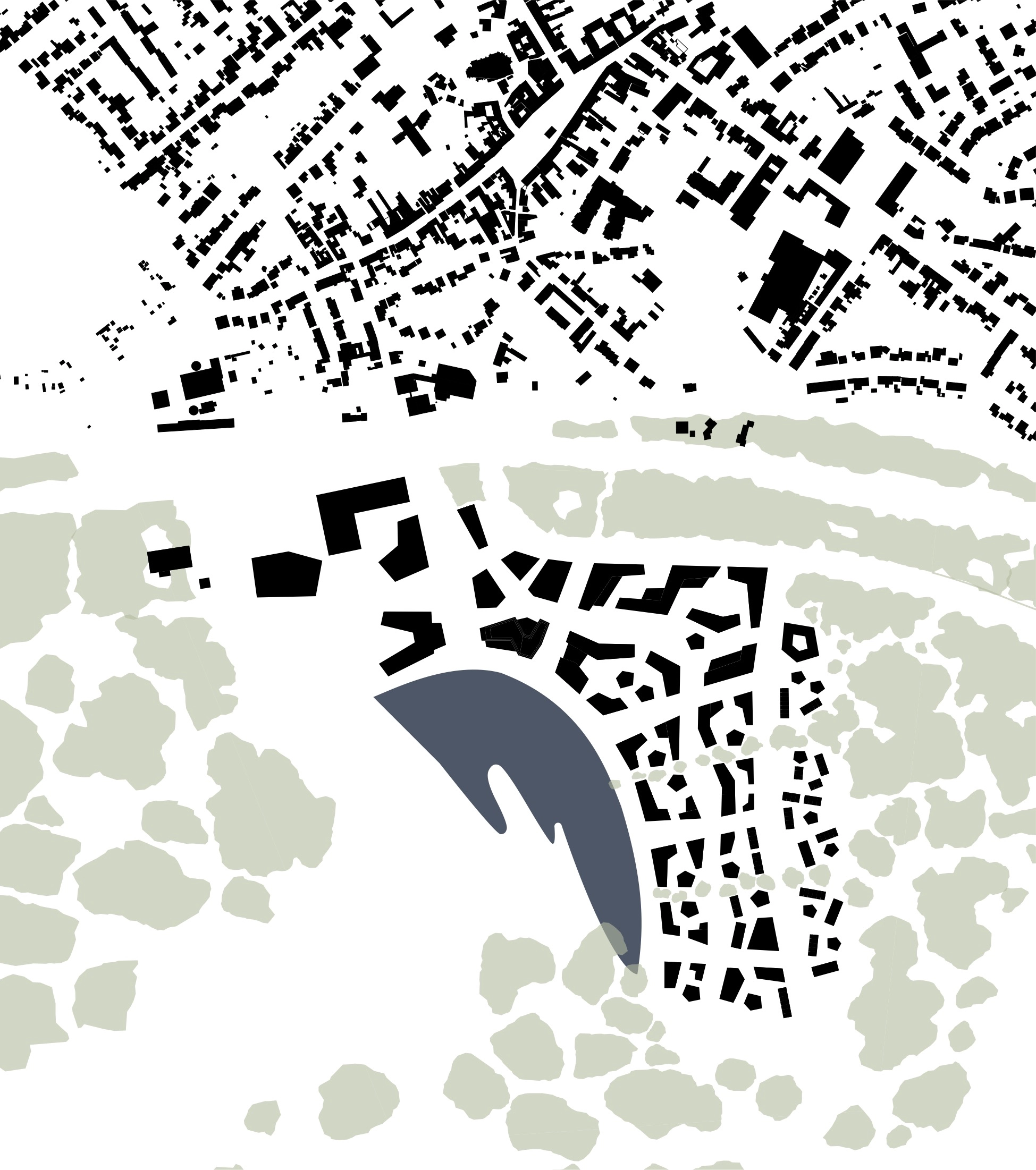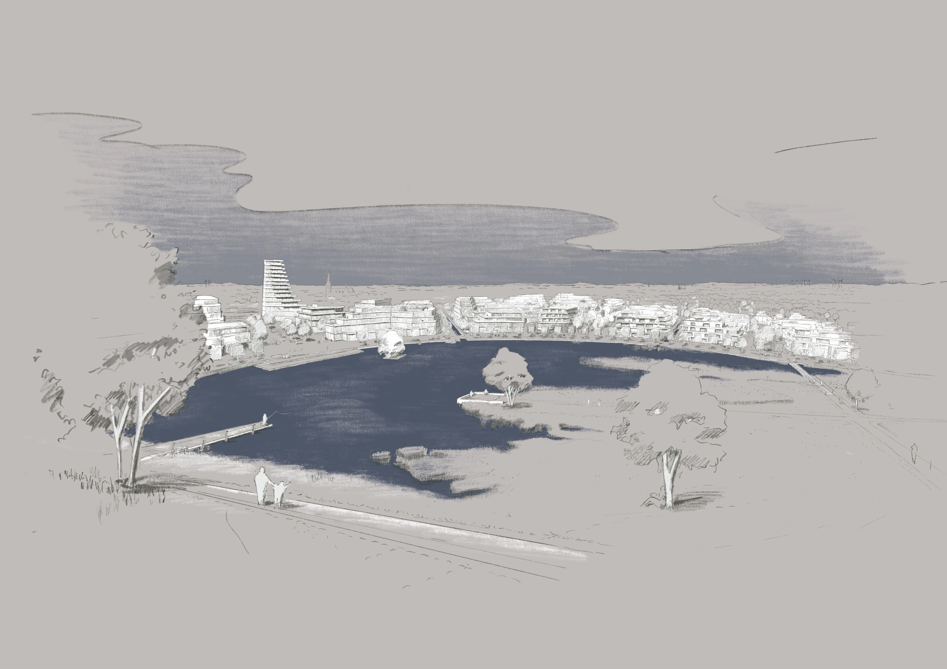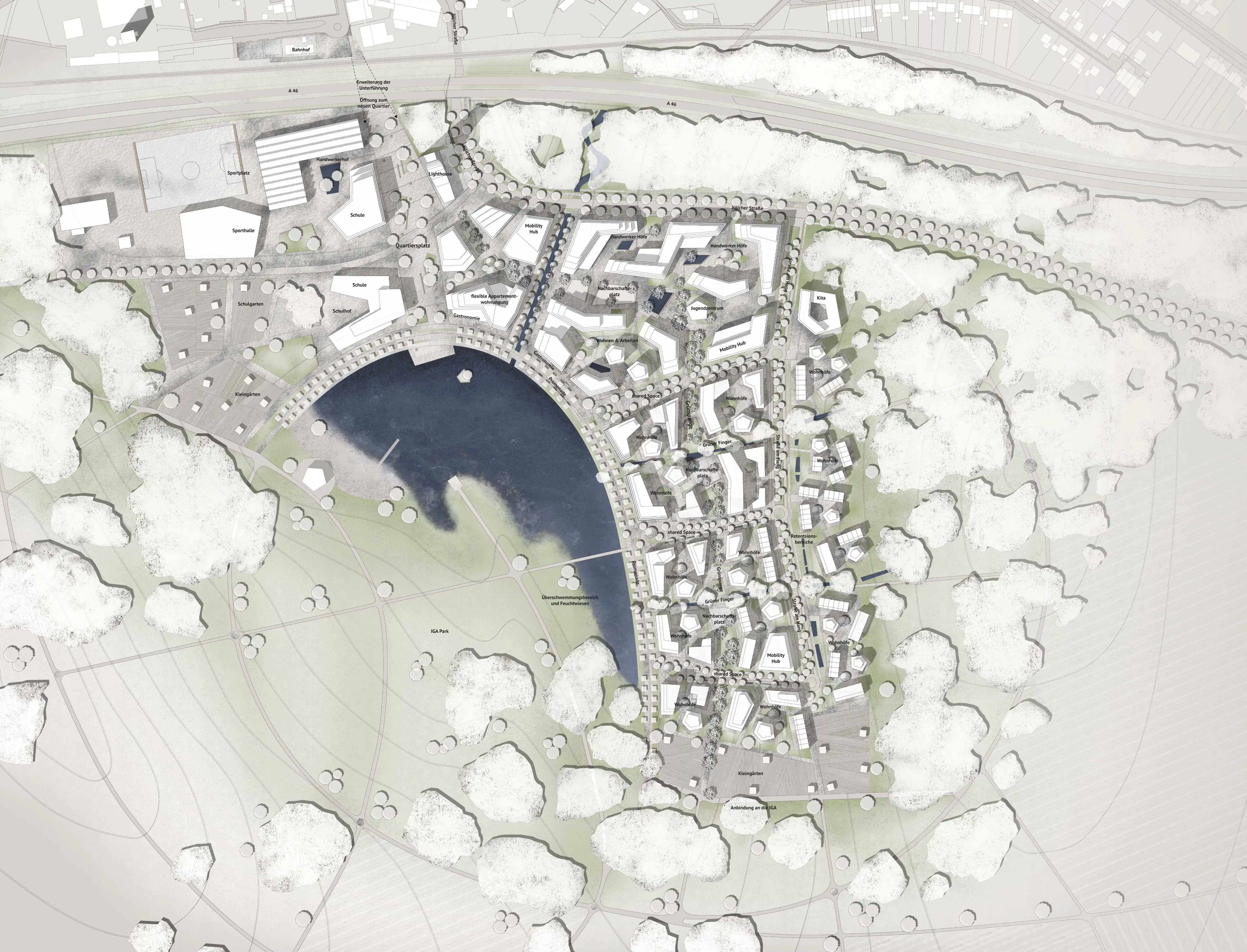 Die Gartenstadt Jüchen ist ein innovatives Wohnquartier im Süden von Jüchen, das im Zuge des Strukturwandels eine nachhaltige Zukunft für die Region schafft. Mit einem starken Fokus auf ökologische, ökonomische und soziale Nachhaltigkeit stärkt es die Identifikation mit der ländlichen Umgebung. Das zentrale Element des Quartiers ist ein See, der als Regenwasserspeicher dient und gleichzeitig die klimatische Regulierung unterstützt. Die polygonalen Baukörper fügen sich harmonisch in die Landschaft ein und bieten mit ihren Balkonen direkten Zugang zu den Freiräumen. Die Gartenstadt fördert gemeinschaftliches Leben, indem sie öffentliche und private Räume verbindet und diverse Begegnungsorte schafft. Ein durchdachtes Mobilitätskonzept priorisiert Fuß- und Radverkehr und sorgt für eine autofreie, nachhaltige Mobilität.