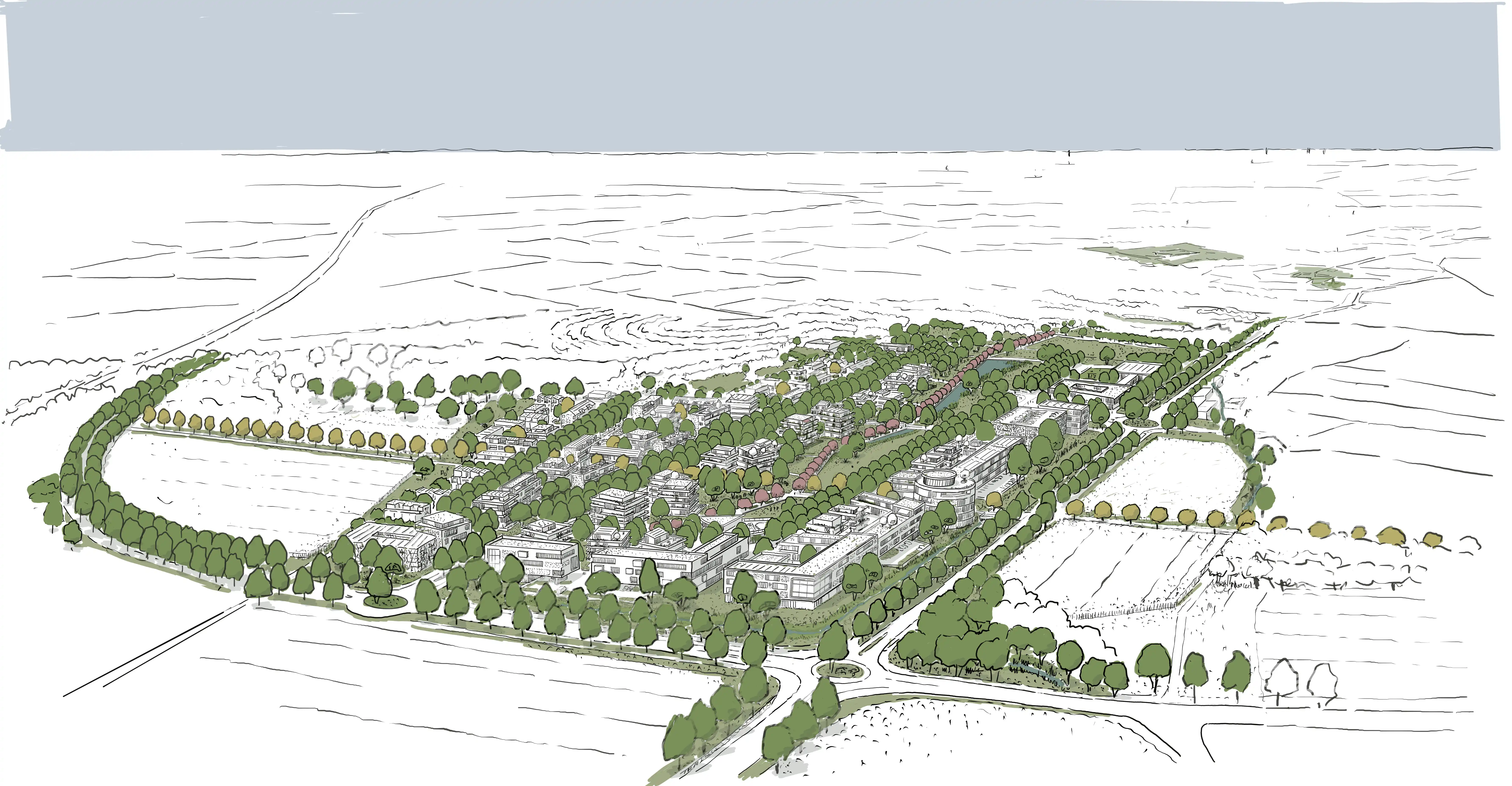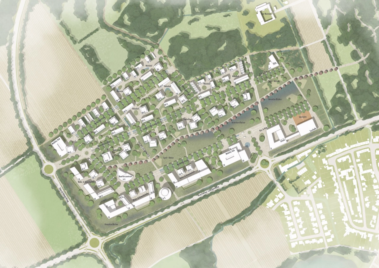 Das Quartier ist über eine Ringstraße erschlossen, die Fußgänger und Radfahrer bevorzugt. Zwei Mobilitätsstationen und Bushaltestellen sorgen für eine gute Erreichbarkeit ohne großen Autoanteil. Das Regenwassermanagement leitet überschüssiges Wasser über Mulden und das Teichsystem in Feuchtwiesen, wo es gespeichert und versickert. So wird das Kanalnetz entlastet und gleichzeitig die ökologische und klimatische Resilienz des Quartiers gestärkt.