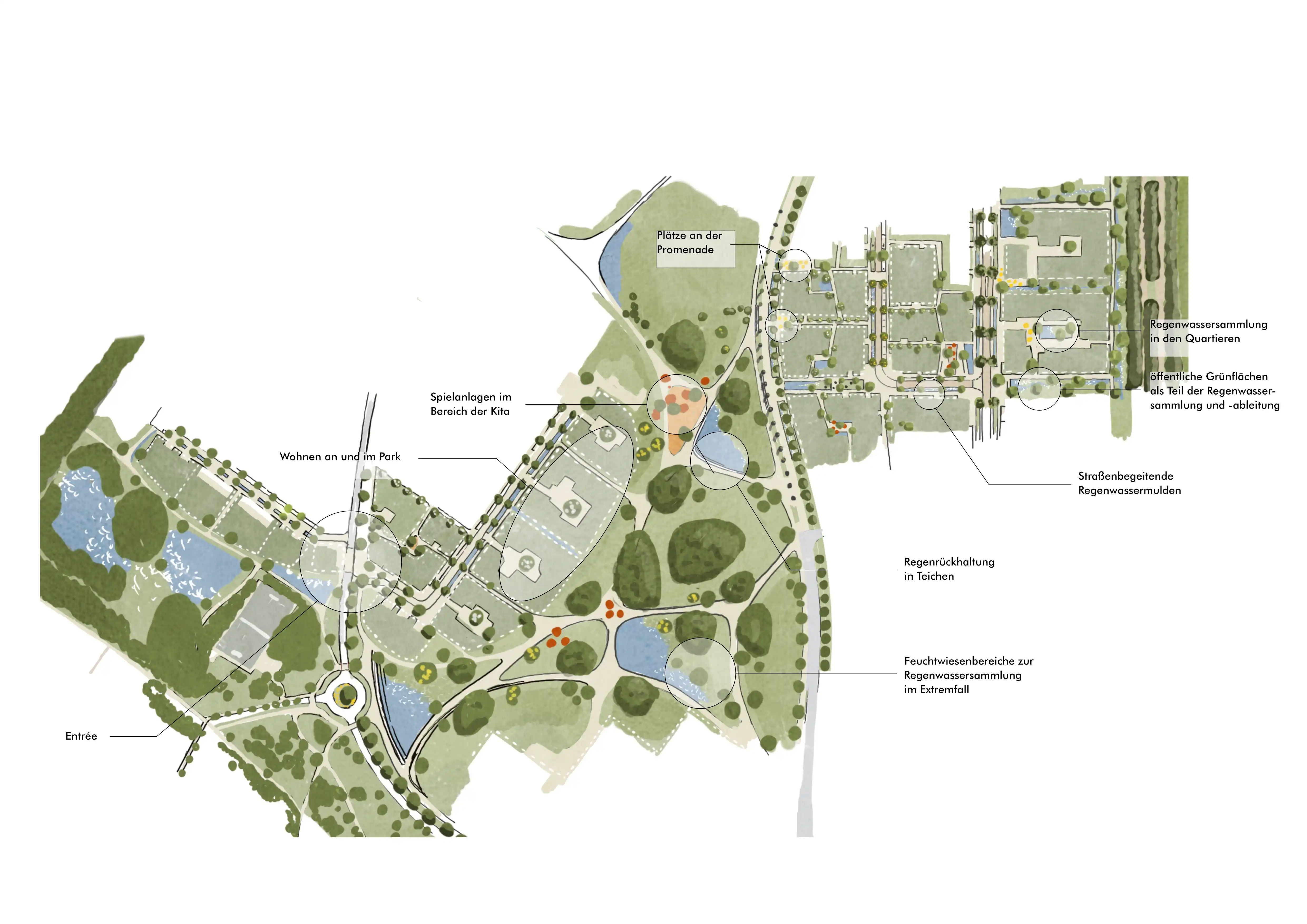 Der Rahmenplan für das ca. 57 ha große Areal „Königspark“ in Königs Wusterhausen verfolgt das Ziel, eine zukunftsfähige und lebendige Quartiersentwicklung zu schaffen, die Arbeitsplätze, Wohnraum, soziale Infrastruktur und Erholungsflächen kombiniert. Geplant sind fünf Quartiere und eine große Grünfläche, die in mehreren Bauabschnitten entstehen sollen, wobei eine flexible Weiterentwicklung ermöglicht wird. Ein nachhaltiges Mobilitätskonzept und Regenwassermanagement sind zentrale Elemente. Die Stadt verfolgt eine städtebauliche Neuplanung, die den aktuellen Bedarf an Wohnraum und die regionalen Entwicklungsperspektiven berücksichtigt. Das Projekt integriert bestehende städtebauliche und wirtschaftliche Planungen und wird durch verschiedene Entwicklungskonzepte der Stadt unterstützt.
