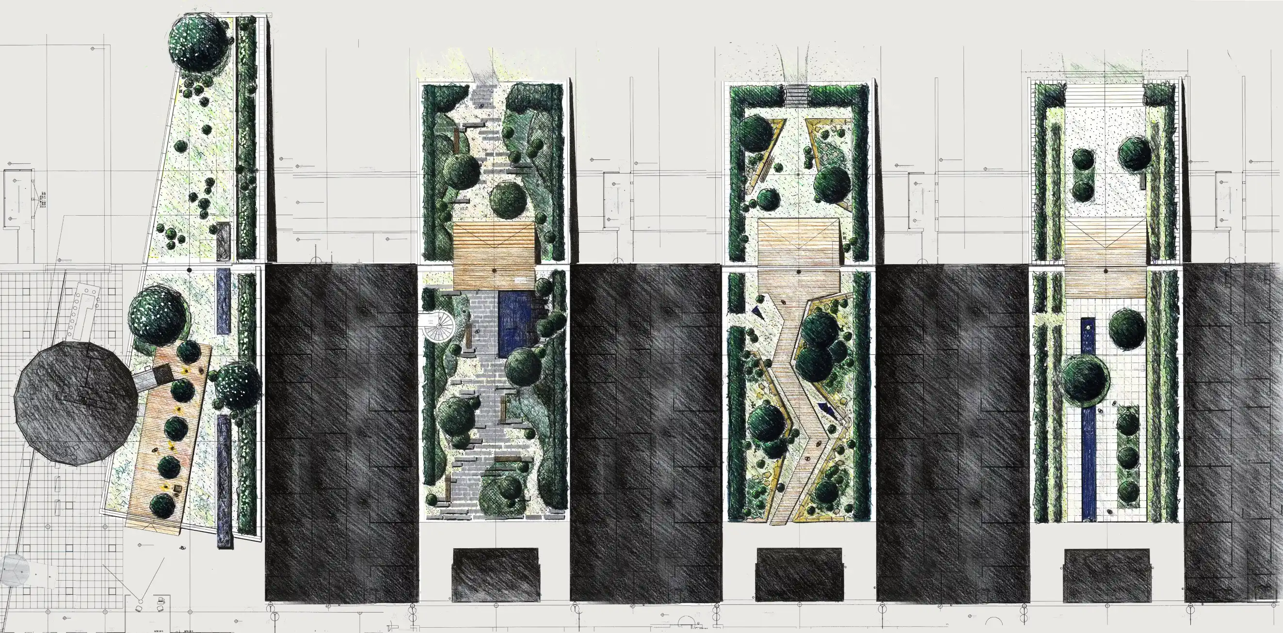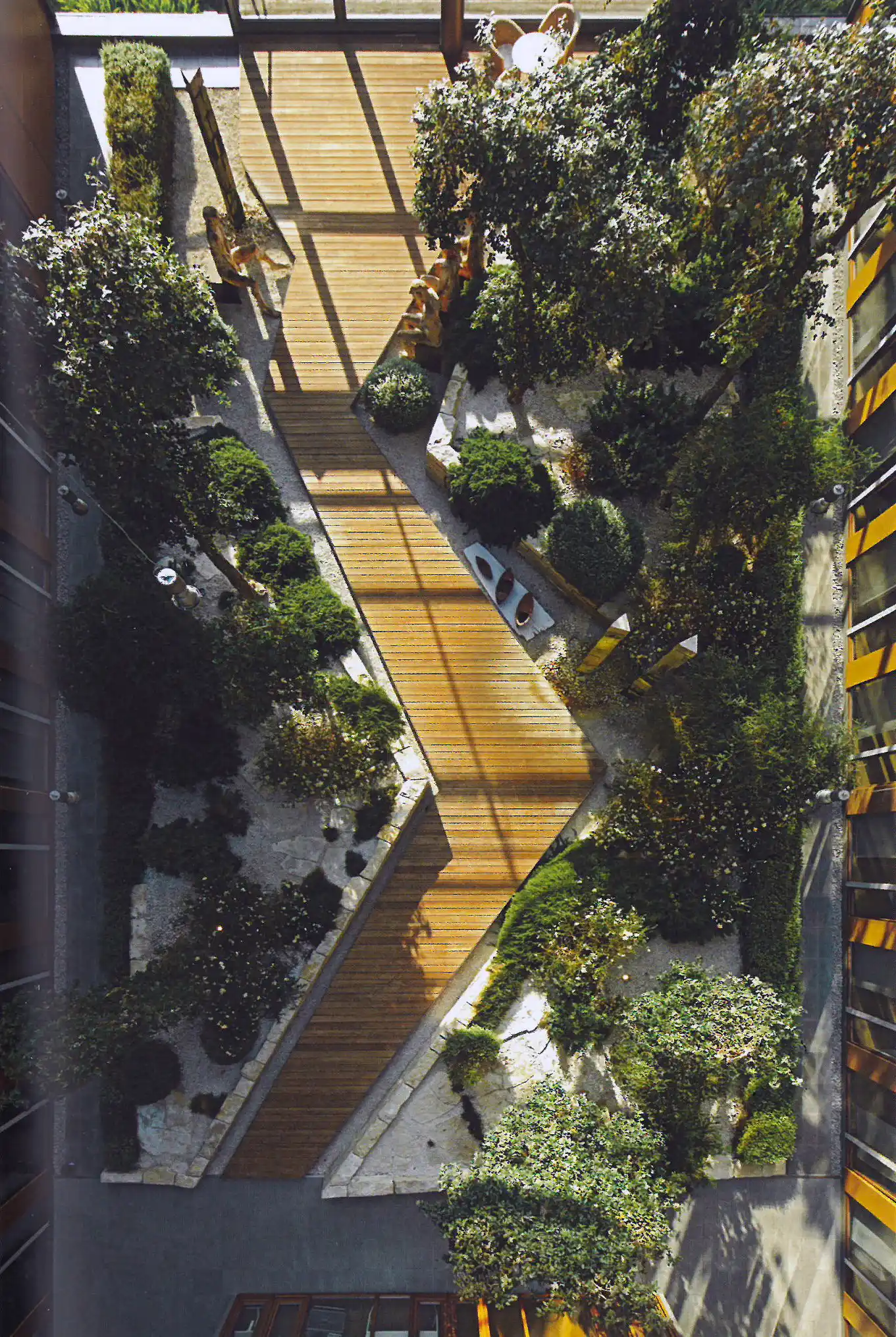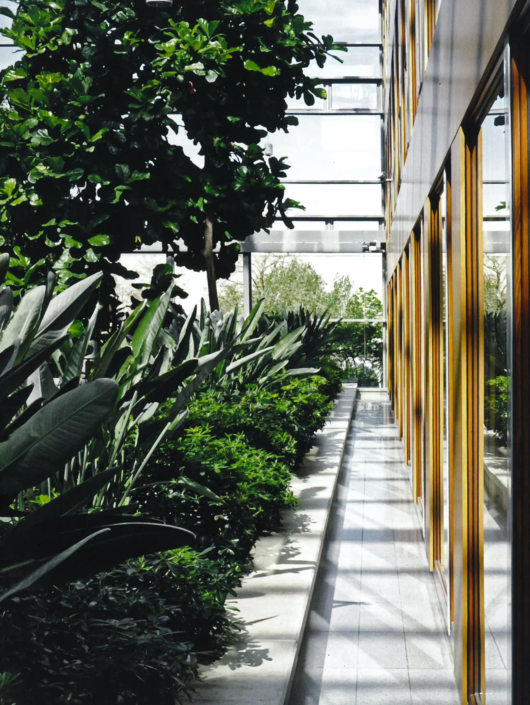 Die Idee der vier Innenhöfe mit unterschiedlichen Landschaftsbildern, die sich auf Terrassen im benachbarten Park fortsetzen, entstand bereits im Wettbewerb. Die Gestaltung der Gartenräume wurde zum Highlight der Hauptverwaltung und trägt zur hohen Mitarbeiterakzeptanz bei. Nach 20 Jahren sind die Anlagen, gepflegt von Herrn Kremkau, nach wie vor ein charaktervolles Aushängeschild des Unternehmens. Die Wintergärten sind mit Großgehölzen aus subtropischen und mediterranen Regionen bepflanzt. Die Materialwahl und Wasseranlagen verbessern das Raumklima und schaffen in jedem Hof eine angenehme Atmosphäre. Leider wird heute in der Planung oft auf solche großen Innenraumbegrünungen verzichtet, da Raumoptimierung und Energieeffizienz als wichtiger gelten, ohne den Mehrwert für das Arbeitsumfeld zu berücksichtigen.