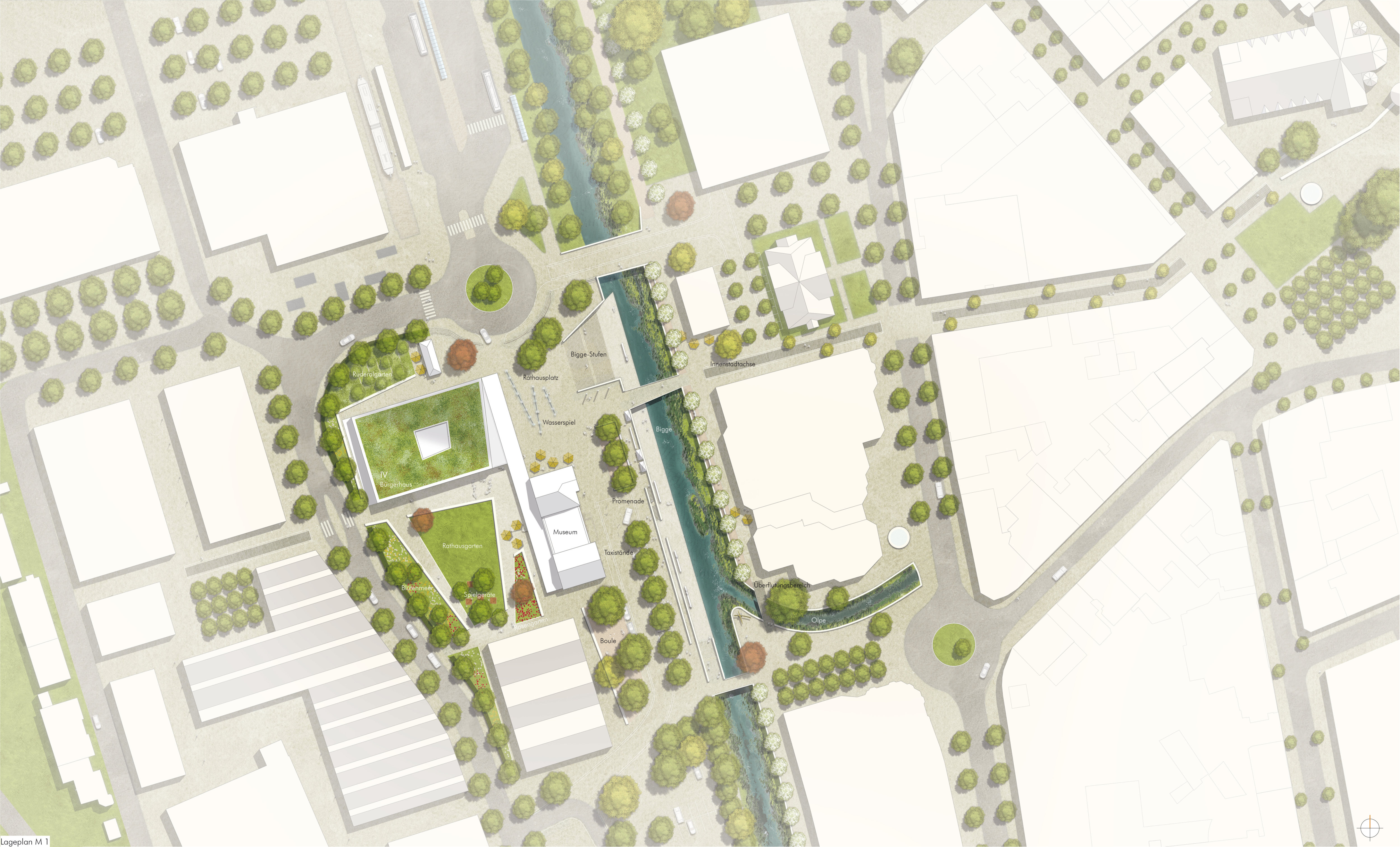 Die Öffnung des Flussbetts am ehemaligen Bahnhofsvorplatz macht die Bigge wieder erlebbar und verstärkt den Grünzug entlang der Bigge als blau-grünes Band. Eine neue Fußgängerbrücke verbindet das Werkshofquartier mit dem Kurkölner Platz. Eine Treppenanlage verbindet die Biggepromenade mit dem begrünten Bachbett und schafft einen zentralen Aufenthaltsbereich. Durch die Renaturierung wird der ursprüngliche Charakter der Bigge wieder erlebbar. Eine terrassierte Promenade ermöglicht direkten Zugang zum Fluss. Das Bachbett mit Überflutungsbereichen aus Steinen und Gräsern lädt zum Spielen ein. Der Uferweg wird bei Hochwasser überflutet. Unter Linden und Kirschbäumen gibt es gastronomische Angebote. Zwei Ebenen sind durch Rampen und Treppen verbunden. Das Bürgerhausumfeld verknüpft Rathaus und altes Bahnhofsgebäude und schafft ein spannendes Ensemble. Der Rathausplatz, Teil der Biggepromenade, ist autofrei und wird mit Fontänen belebt. Der Rosengarten bietet eine grüne Oase mit Spielmöglichkeiten. Der rückwärtige Bereich des Stellwerks wird als Ruderalgarten gestaltet und erinnert an die Eisenbahngeschichte.