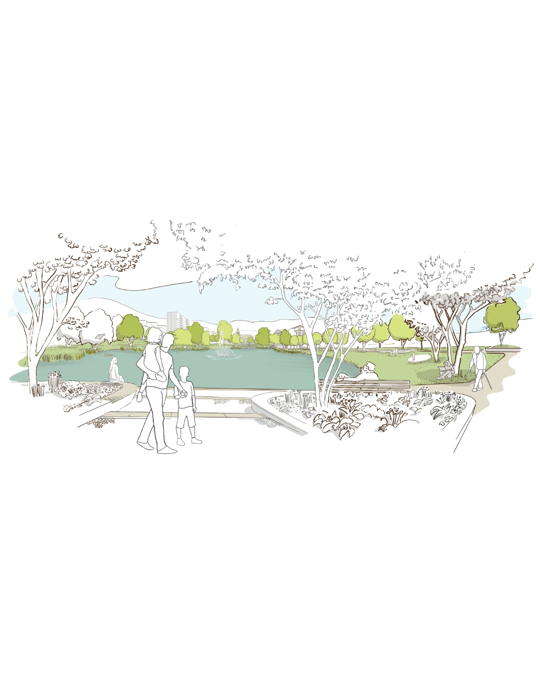 Der Entwurf nutzt die bestehende Topografie, die angrenzenden Funktionen und den wertvollen Baumbestand, um ein zusammenhängendes aber differenziertes Parkbild zu schaffen. Ziel ist eine klare räumliche Einheit mit hoher Aufenthaltsqualität und einem abwechslungsreichen Rundgang um das Gewässer herum. Teich und Fontäne können von den vier verschiedenen Uferbereichen auf unterschiedliche Weise erlebt werden. Rund um den Teich wird eine drei Meter breite Flachwasserzone mit Schotter angelegt. Sie gewährleistet Sicherheit ohne Geländer und macht den Kontakt zum Wasser selbstverständlich. Durch die Wasserkaskaden auf der Südseite wird insbesondere für Kinder das Element Wasser spielerisch erlebbar. So wird neben dem Herrenteich auch eine Möglichkeit eröffnet, spielerisch mit dem Element Wasser in Berührung zu kommen.