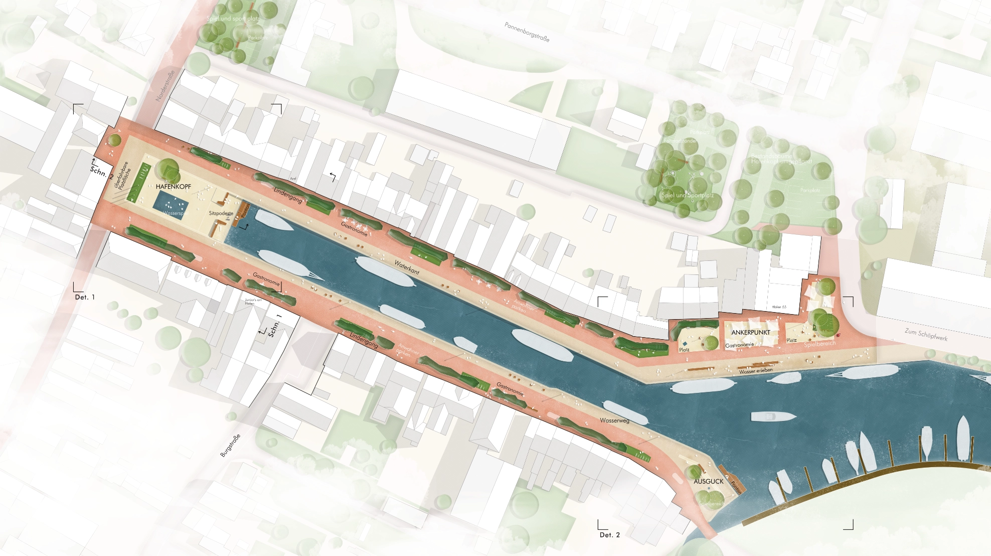 Der Hafenplatz wird offener und sichtbarer gestaltet, Sichtbarrieren und Stellplätze entfernt, um Raum für Veranstaltungen und Verweilen zu schaffen. Der Ankerpunkt im Osten mit Gastronomie wird strukturiert ausgebaut, und der ehemalige Autowendekreis dient künftig als Aufenthaltsbereich. Der Ausblick am südöstlichen Hafenrand erhält barrierefreien Zugang zum Wasser sowie Spiel- und Sitzmöglichkeiten.