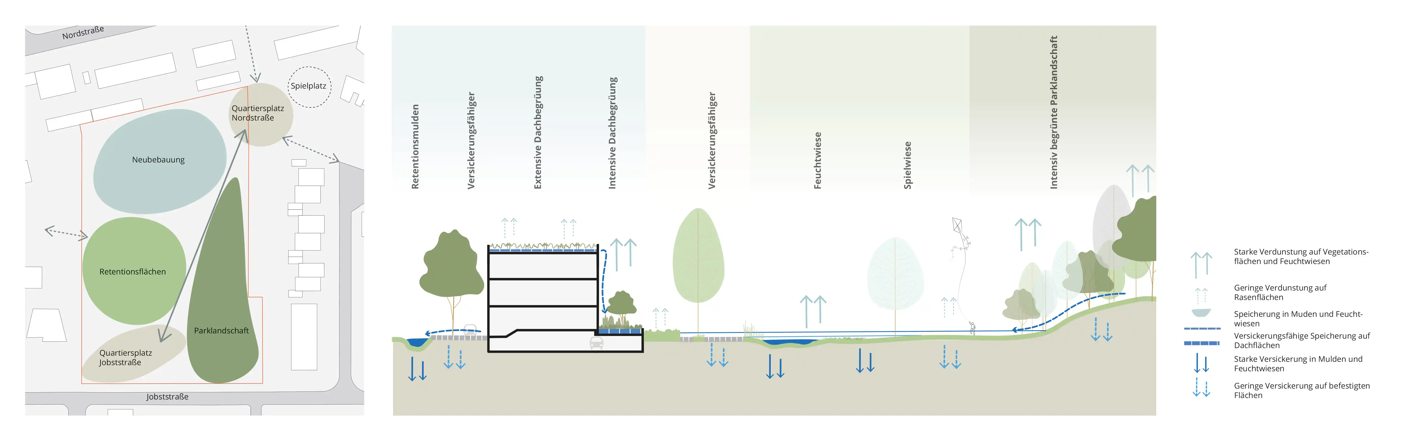Das gesamte Areal umfasst eine Fläche von rund 12.000 m², bestehend aus dem Sportplatz, dem angrenzenden Kinderspielplatz und der ehemaligen Zufahrt. Rund ein Drittel der Gesamtfläche soll als Wohnbauland für Neubauten zur Verfügung stehen. Diese sollen am nördlichen Rand des Sportplatzes entstehen und sich an der bisherigen Bebauung orientieren. Das Highlight des Projektes ist jedoch der entstehende Quartierspark, der durch seine Gestaltung exemplarisch verschiedene Nutzungsangebote mit den Möglichkeiten eines zeitgemäßen Regenwassermanagements aufzeigen soll.