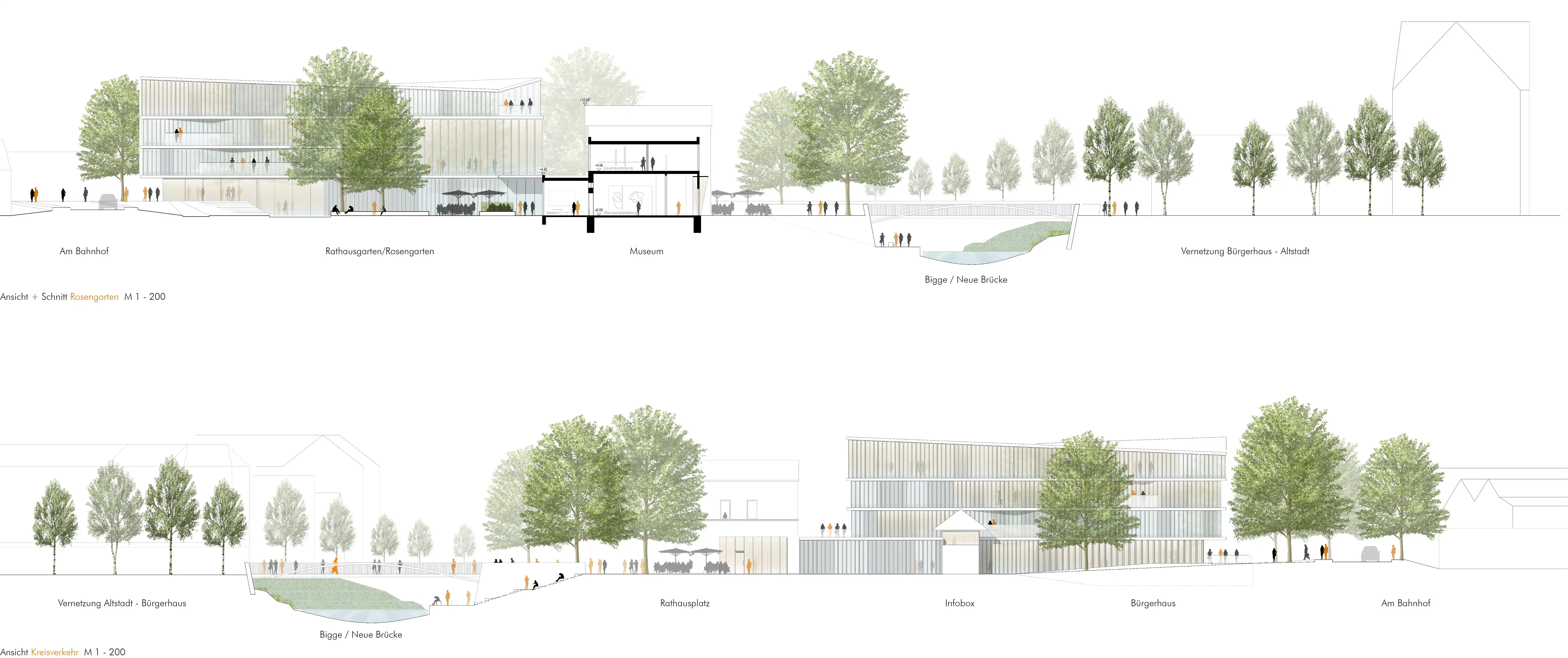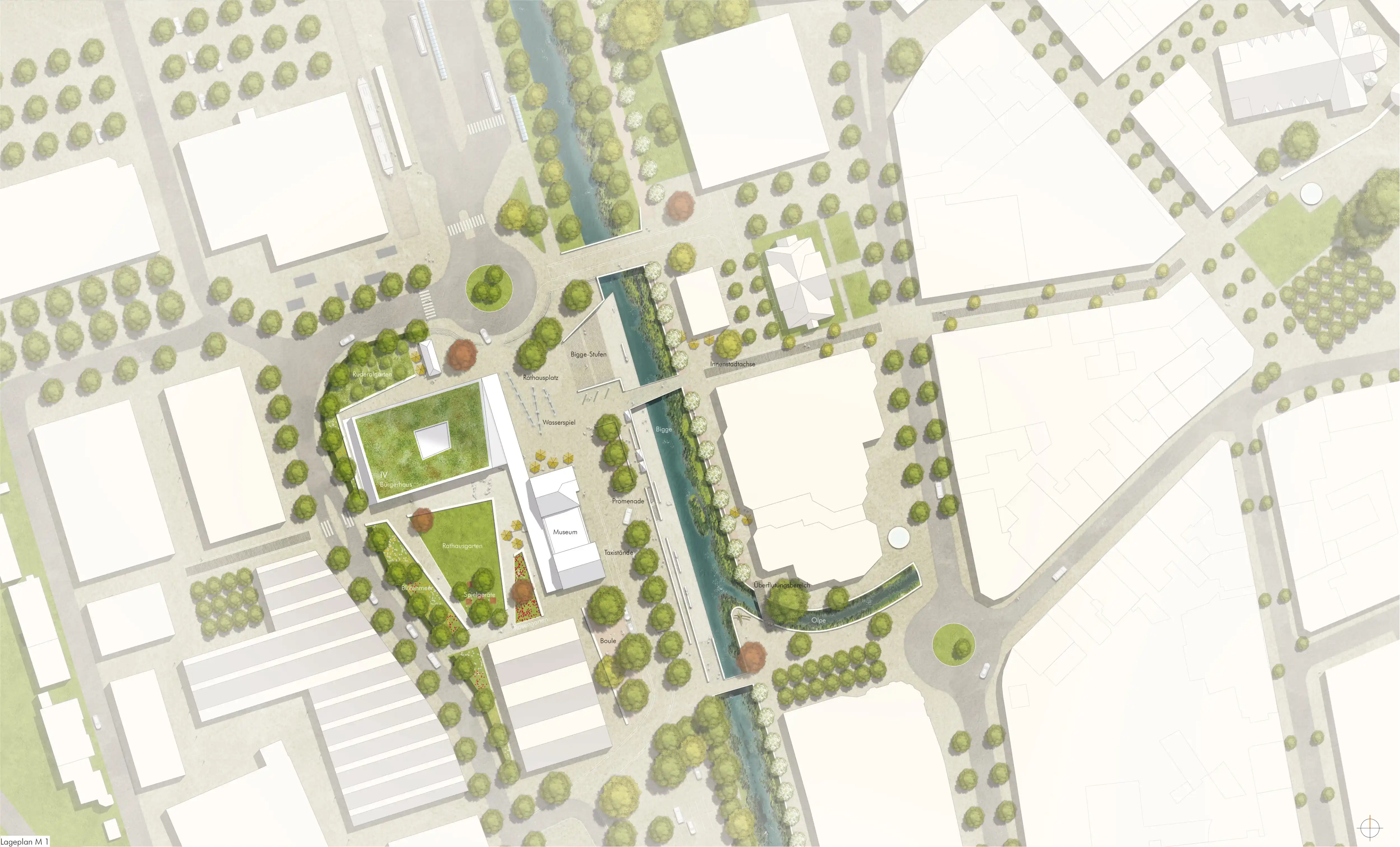 Die Öffnung des Flussbetts am ehemaligen Bahnhofsvorplatz macht die Bigge wieder erlebbar und verstärkt den Grünzug entlang der Bigge als blau-grünes Band. Eine neue Fußgängerbrücke verbindet das Werkshofquartier mit dem Kurkölner Platz. Eine Treppenanlage verbindet die Biggepromenade mit dem begrünten Bachbett und schafft einen zentralen Aufenthaltsbereich. Durch die Renaturierung wird der ursprüngliche Charakter der Bigge wieder erlebbar. Eine terrassierte Promenade ermöglicht direkten Zugang zum Fluss. Das Bachbett mit Überflutungsbereichen aus Steinen und Gräsern lädt zum Spielen ein. Der Uferweg wird bei Hochwasser überflutet. Unter Linden und Kirschbäumen gibt es gastronomische Angebote. Zwei Ebenen sind durch Rampen und Treppen verbunden. Das Bürgerhausumfeld verknüpft Rathaus und altes Bahnhofsgebäude und schafft ein spannendes Ensemble. Der Rathausplatz, Teil der Biggepromenade, ist autofrei und wird mit Fontänen belebt. Der Rosengarten bietet eine grüne Oase mit Spielmöglichkeiten. Der rückwärtige Bereich des Stellwerks wird als Ruderalgarten gestaltet und erinnert an die Eisenbahngeschichte.
