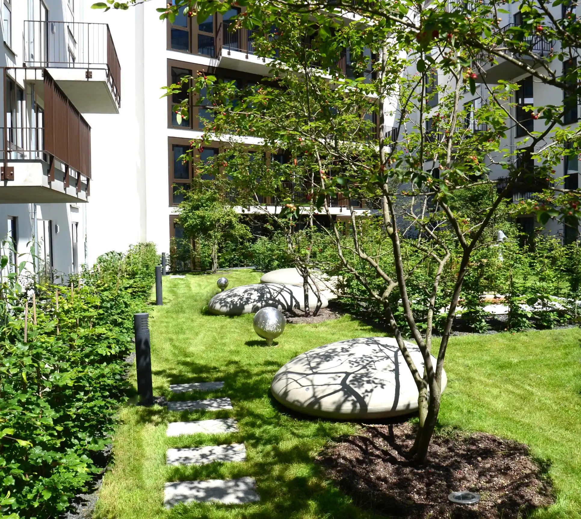 Der Wohn- und Geschäftskomplex besteht aus zwei je 7-geschossigen Neubauten mit Innenhof und Tiefgaragen. Die Bebauung an den Ufern des Humboldthafens ist als offene Arkade, deren Stützen aus Naturstein besteht, ausgeführt.