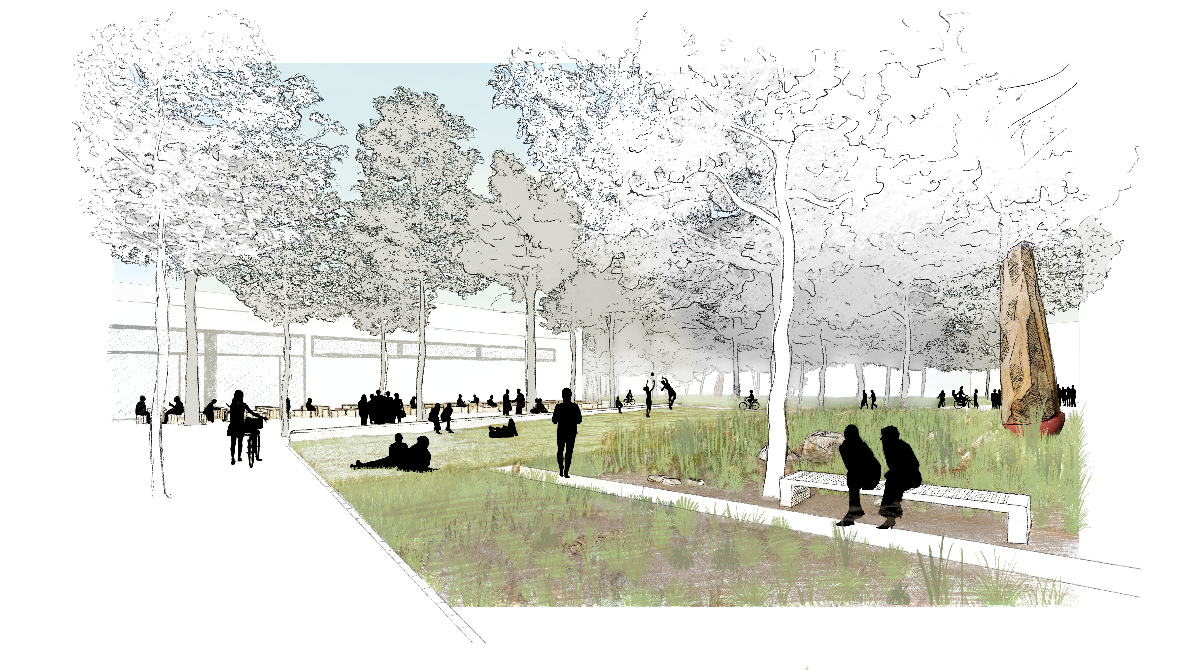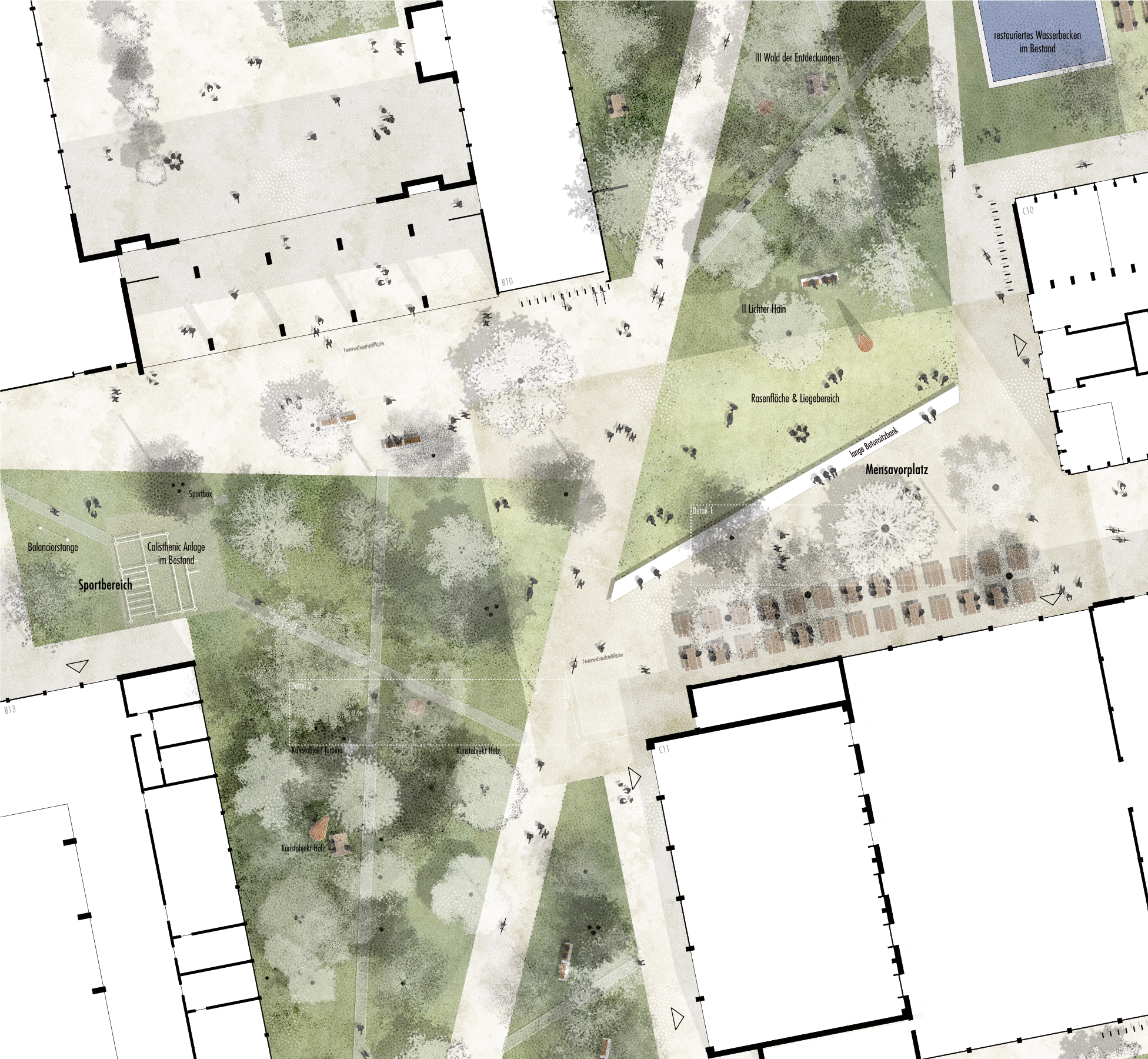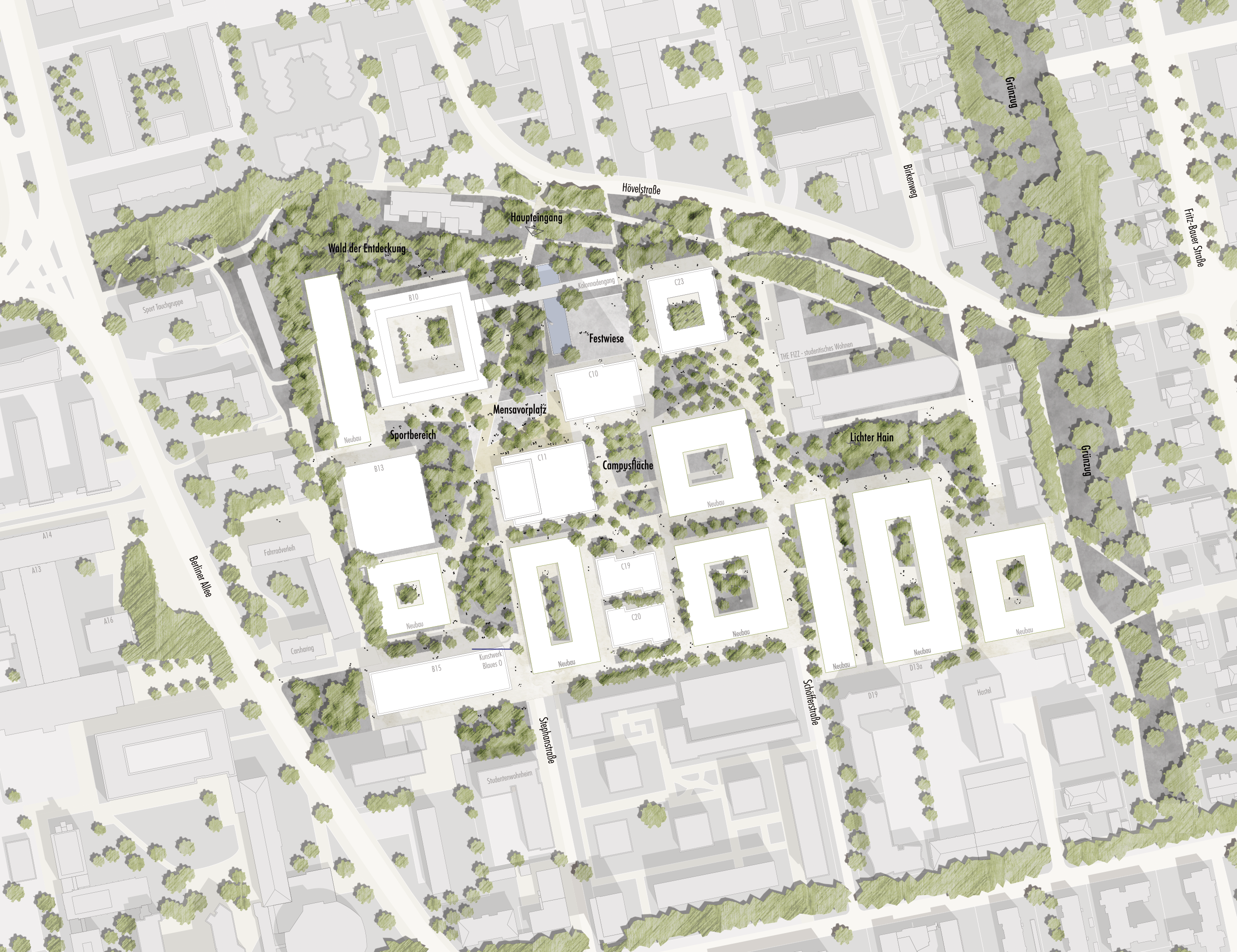 Der Hochschulcampus soll eine inspirierende Atmosphäre schaffen, die neben Funktionalität, Raum für Erholung und kreative Entfaltung bietet. Die Gestaltung fördert Wandel und neue Lösungen, während der direkte Kontakt zur Natur zu einer Auseinandersetzung mit dem Leben anregt. Während die Institutsgebäude funktional sind, dient der Campus als Raum für Begegnung und Austausch. Im stetigen baulichen Wandel folgen die Freiflächen einem Masterplan, der flexibel bleibt. Zentrales Konzept ist es, viele Bäume zu pflanzen, die den Campus prägen, Schatten spenden und eine dynamische Landschaft schaffen. Diese Naturflächen bieten offene Landschaften, lichte Haine und artenreiches Gehölz für Bewegung, Ruhe und Entdeckung. Ein Kunstprojekt, „Die Suche nach dem tanzenden Stern“, fügt dem Campus eine poetische Dimension hinzu: Bäume, die wie tanzende Sterne den Himmel berühren, spiegeln die Verbindung von Natur und Wissenschaft wider. Sie können jederzeit umziehen und ihre Reise fortsetzen, was die lebendige Veränderung des Campus betont.