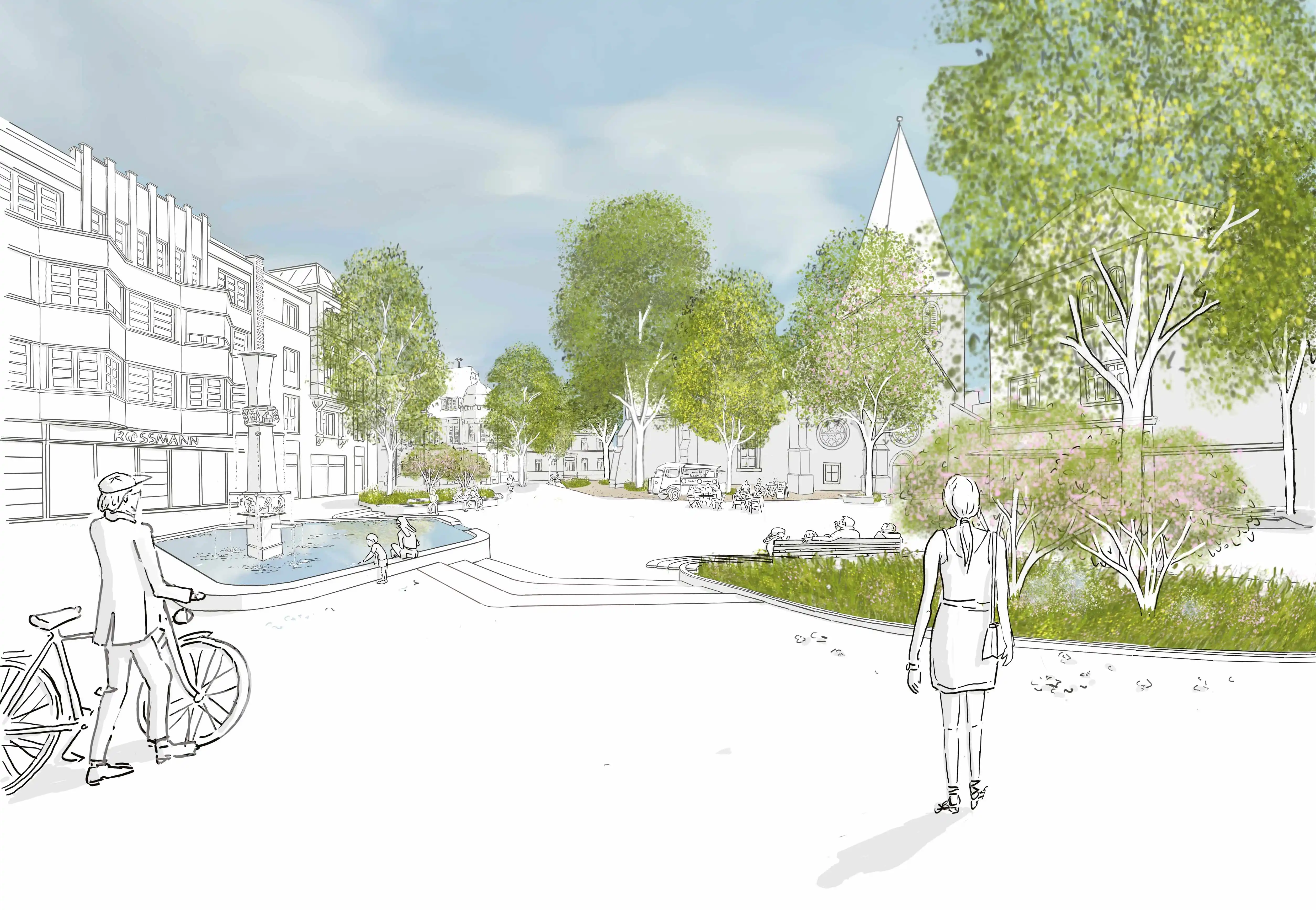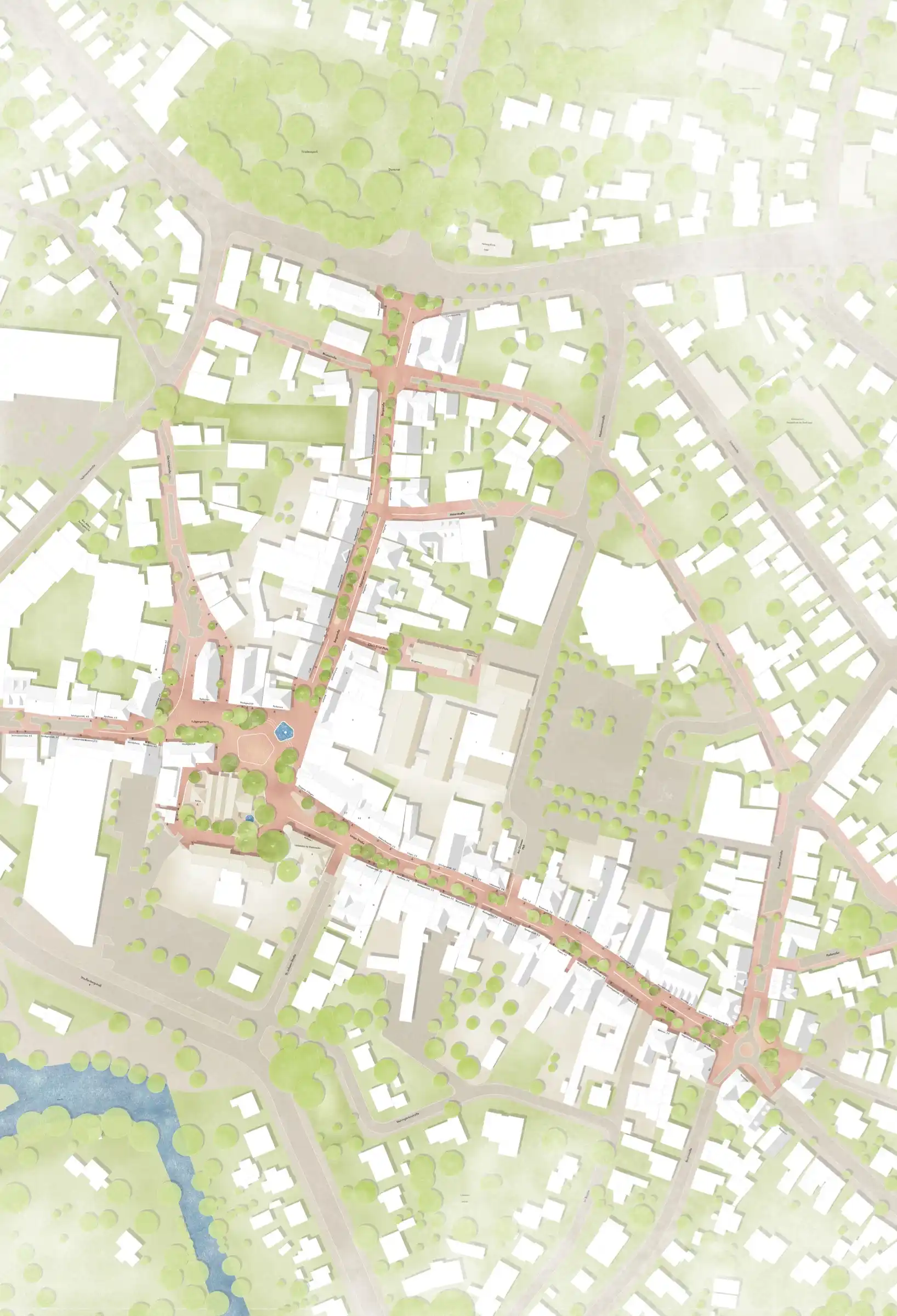 Die Umgestaltung der Fußgängerzone in Lage schafft ein grünes Band aus bepflanzten Inseln, dass die Innenstadt verschönert und die Aufenthaltsqualität durch Bänke und Spielangebote verbessert. Der Marktplatz und Kirchplatz bilden das zentrale "Wohnzimmer" der Stadt, mit einem großzügigen Ziegelpflaster und einer Beleuchtung, die den Platz auch nachts einladend macht. Der Marktplatz wird mit Sitzbänken, neuen Pflanzbeeten und einer besonderen Beleuchtung des Zieglerbrunnens aufgewertet.