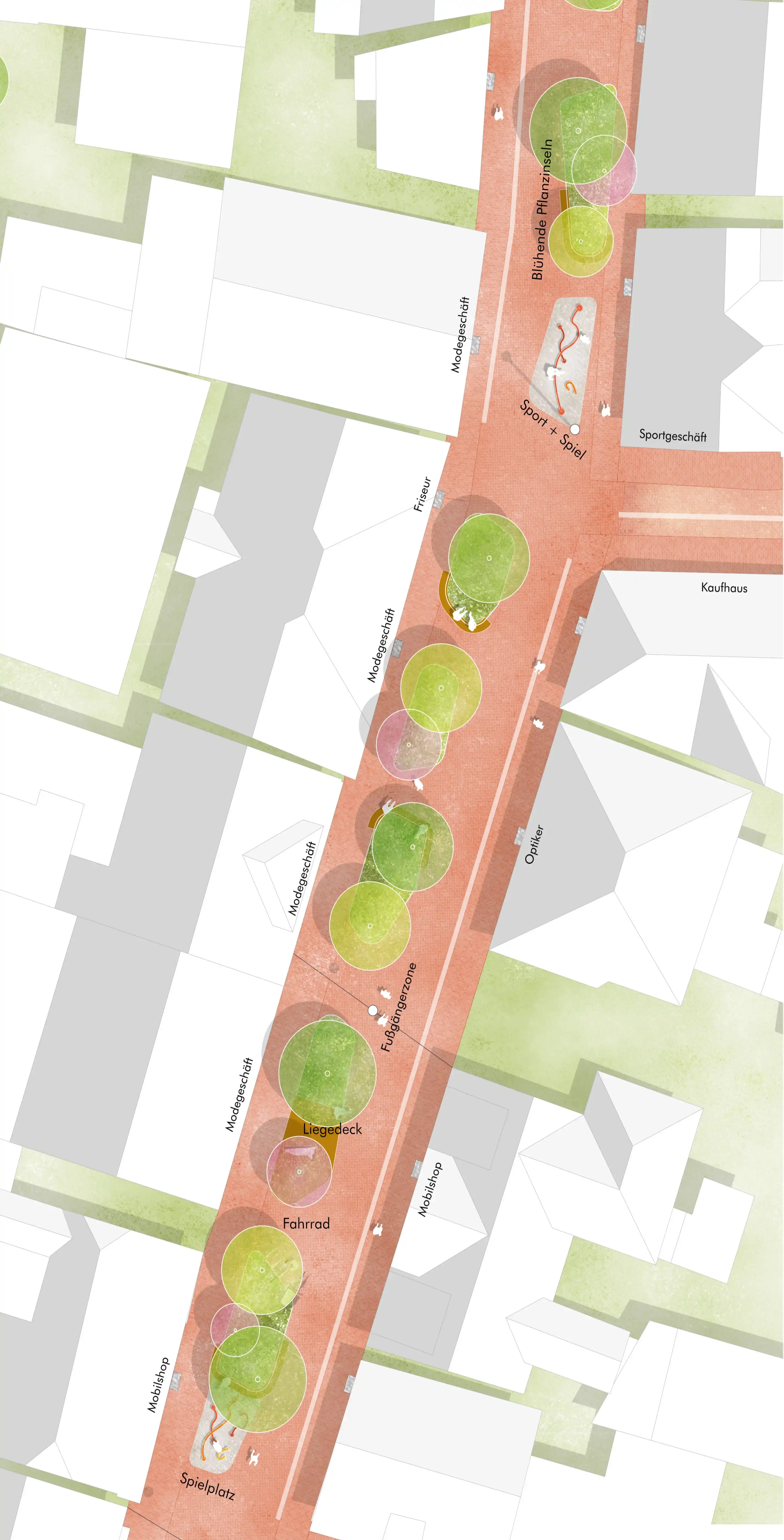 Die Bergstraße und Lange Straße werden als Flaniermeilen gestaltet, mit einem Fischgrätverband aus Ziegelpflaster und zusätzlichen Grünflächen, die durch den Rückbau von Stellplätzen entstehen. Neue Baumstandorte und Aufenthaltsbereiche sorgen für eine erhöhte Aufenthaltsqualität, während die Beleuchtung ein atmosphärisches Lichtspiel erzeugt. Der nördliche Stadteingang an der Bergstraße wird durch größere Mastleuchten betont.