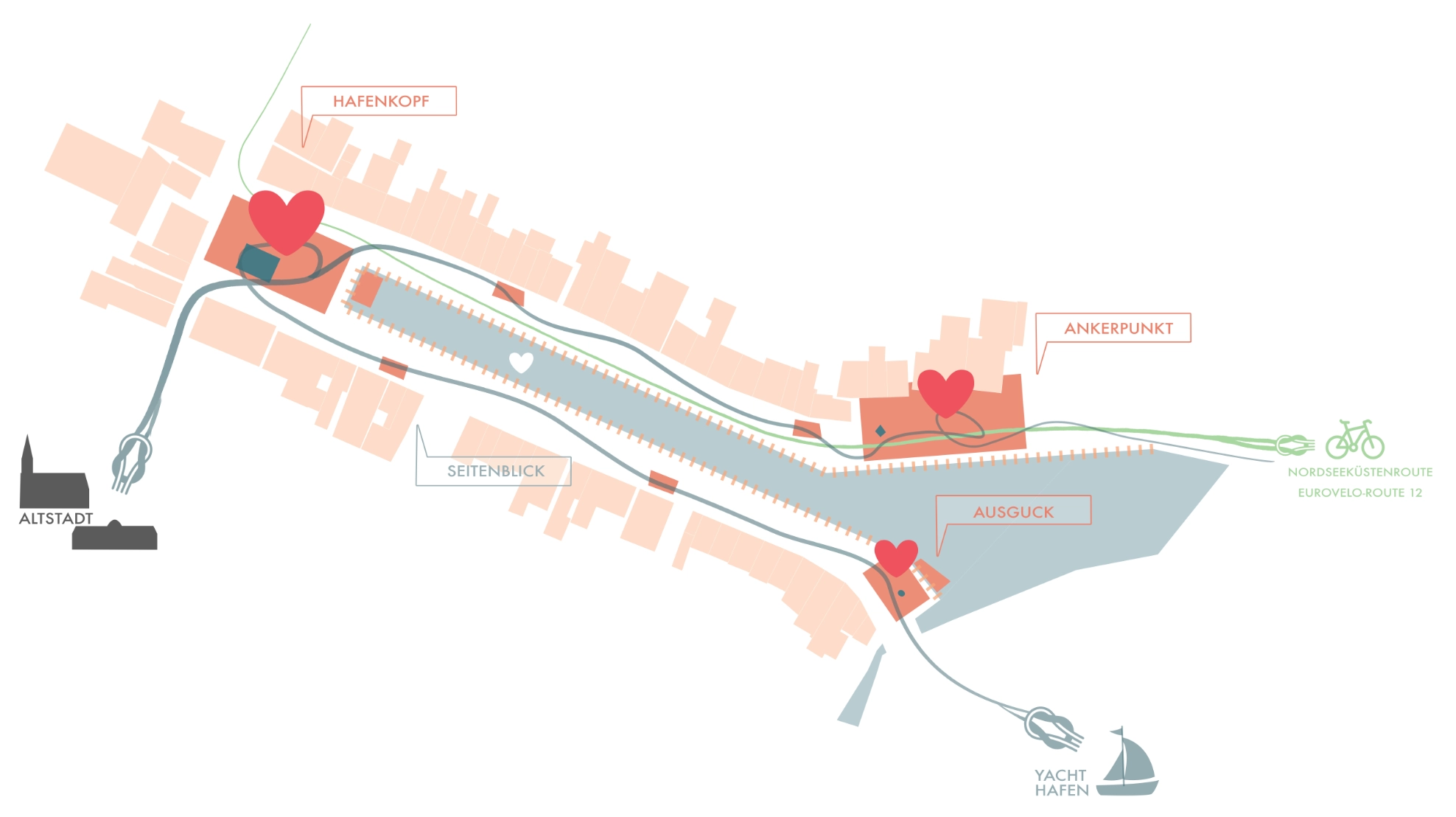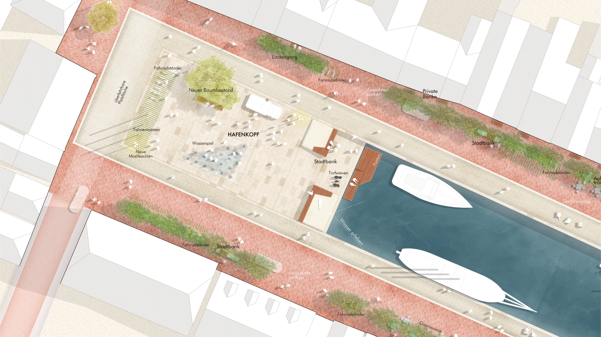 Der Hafenplatz wird offener und sichtbarer gestaltet, Sichtbarrieren und Stellplätze entfernt, um Raum für Veranstaltungen und Verweilen zu schaffen. Der Ankerpunkt im Osten mit Gastronomie wird strukturiert ausgebaut, und der ehemalige Autowendekreis dient künftig als Aufenthaltsbereich. Der Ausblick am südöstlichen Hafenrand erhält barrierefreien Zugang zum Wasser sowie Spiel- und Sitzmöglichkeiten.