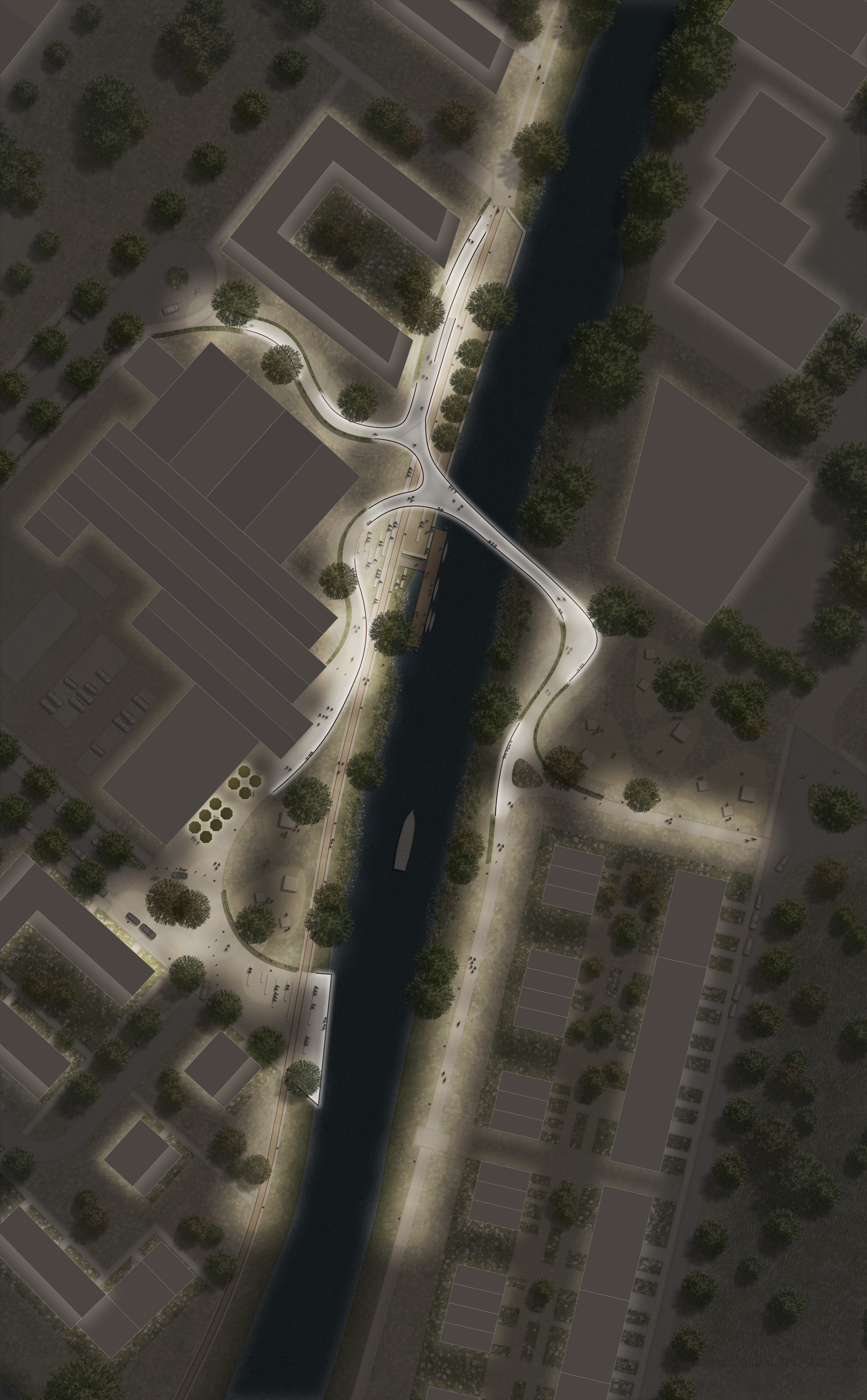 Am östlichen Brückenkopf erlaubt eine großzügige Aufweitung zunächst das Verweilen. Von hier aus geht es in einem sanften Bogen auf die Westseite, wo sich die Brücke gabelt. Während der eine Arm in Richtung Schulzentrum und hinunter zur Uferpromenade führt, schwingt der andere auf die Austrittsebene des Einzelhandelszentrums. In der Fortführung wird so zudem die Platzkante des Einkaufszentrums definiert.